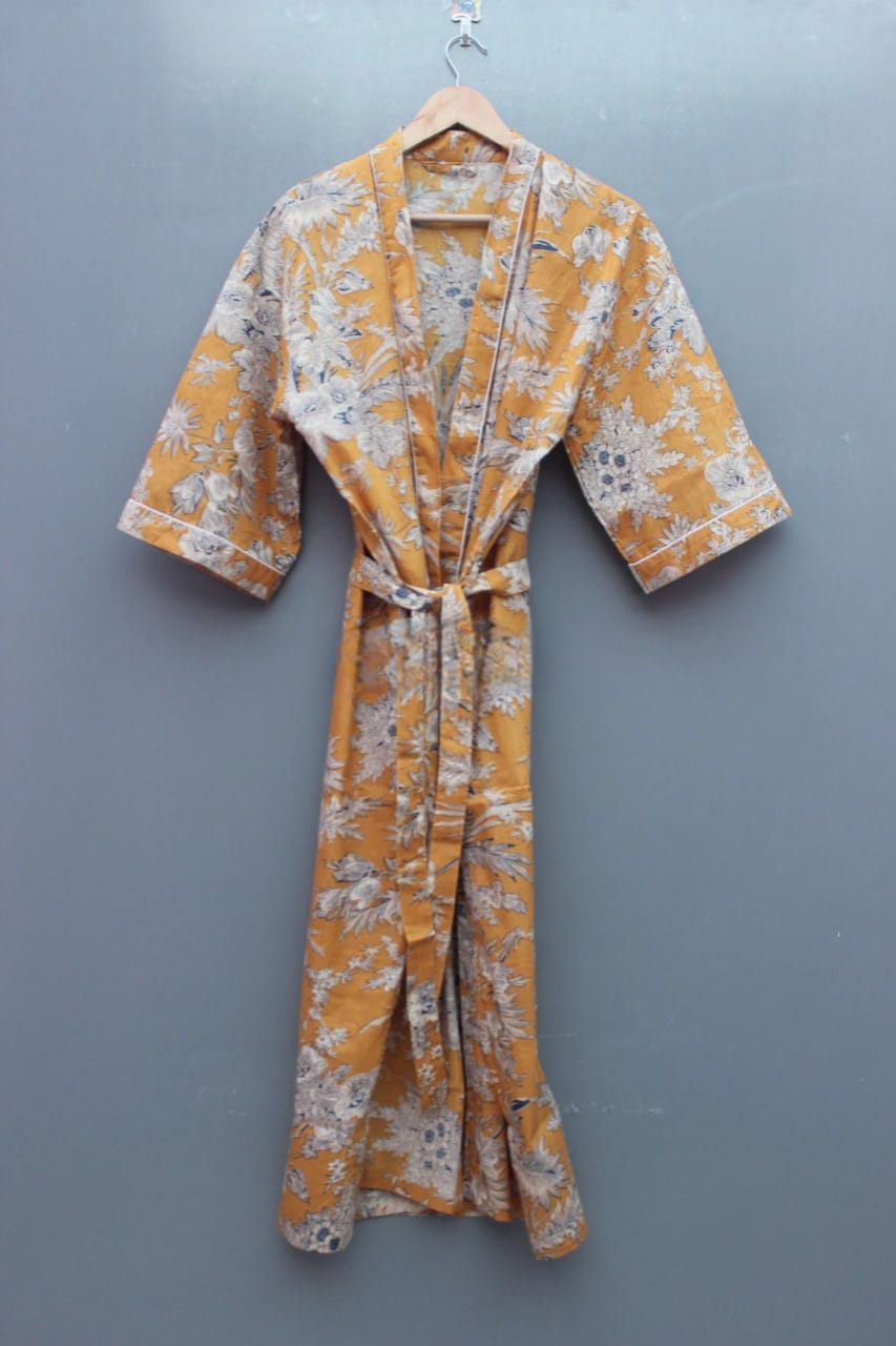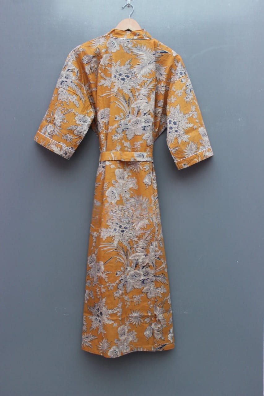 Light Orange Floral Printed Cotton Kimono Indian Boho Robe Summer Dress Beach Coverup
