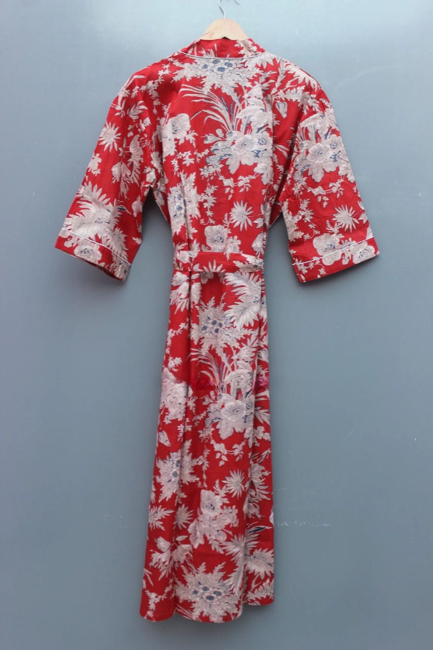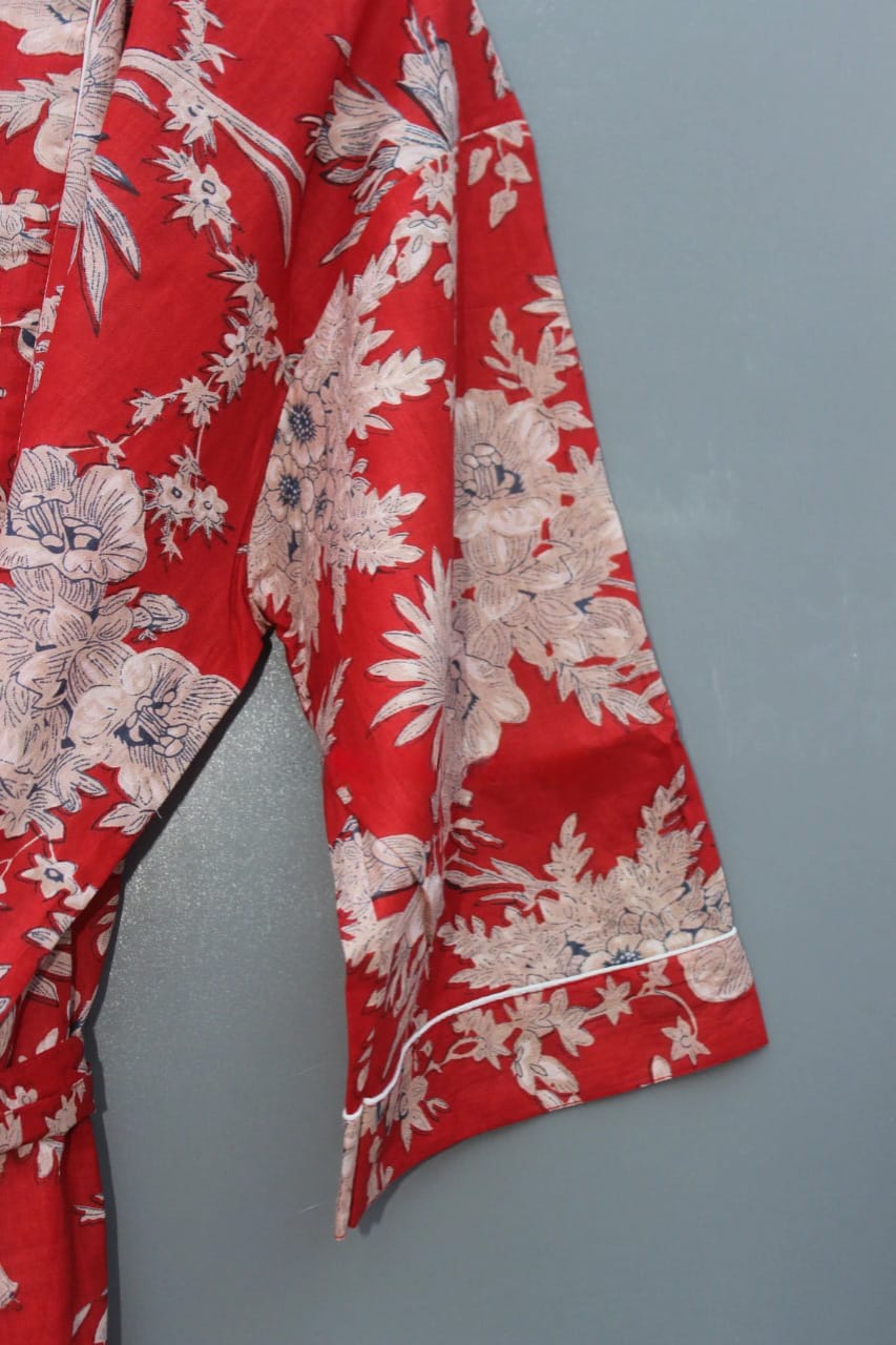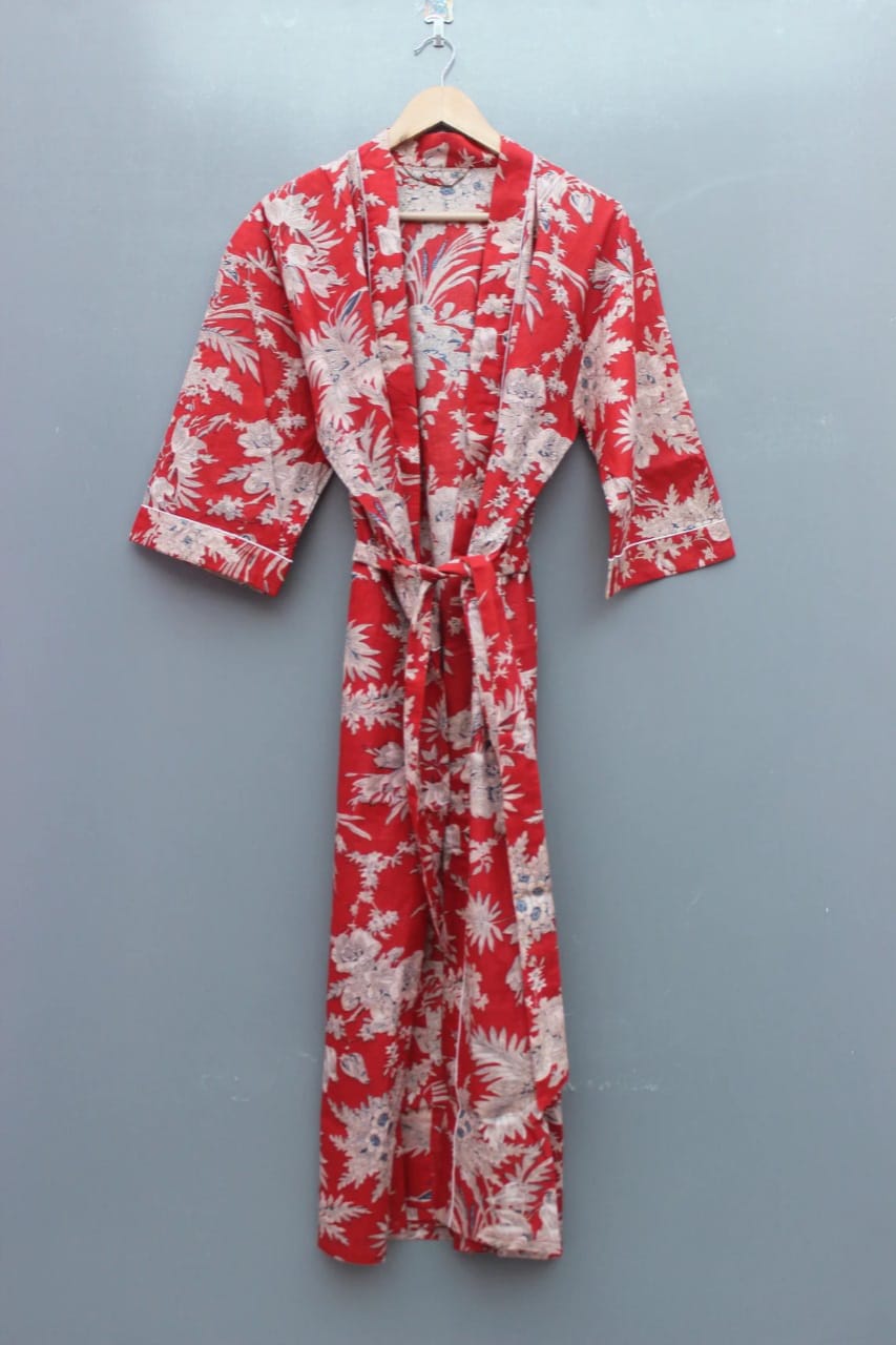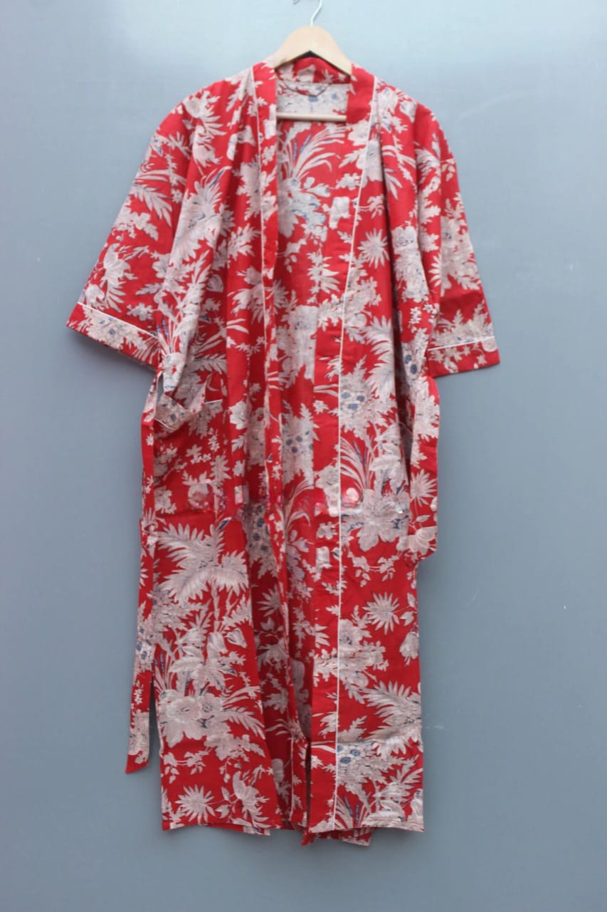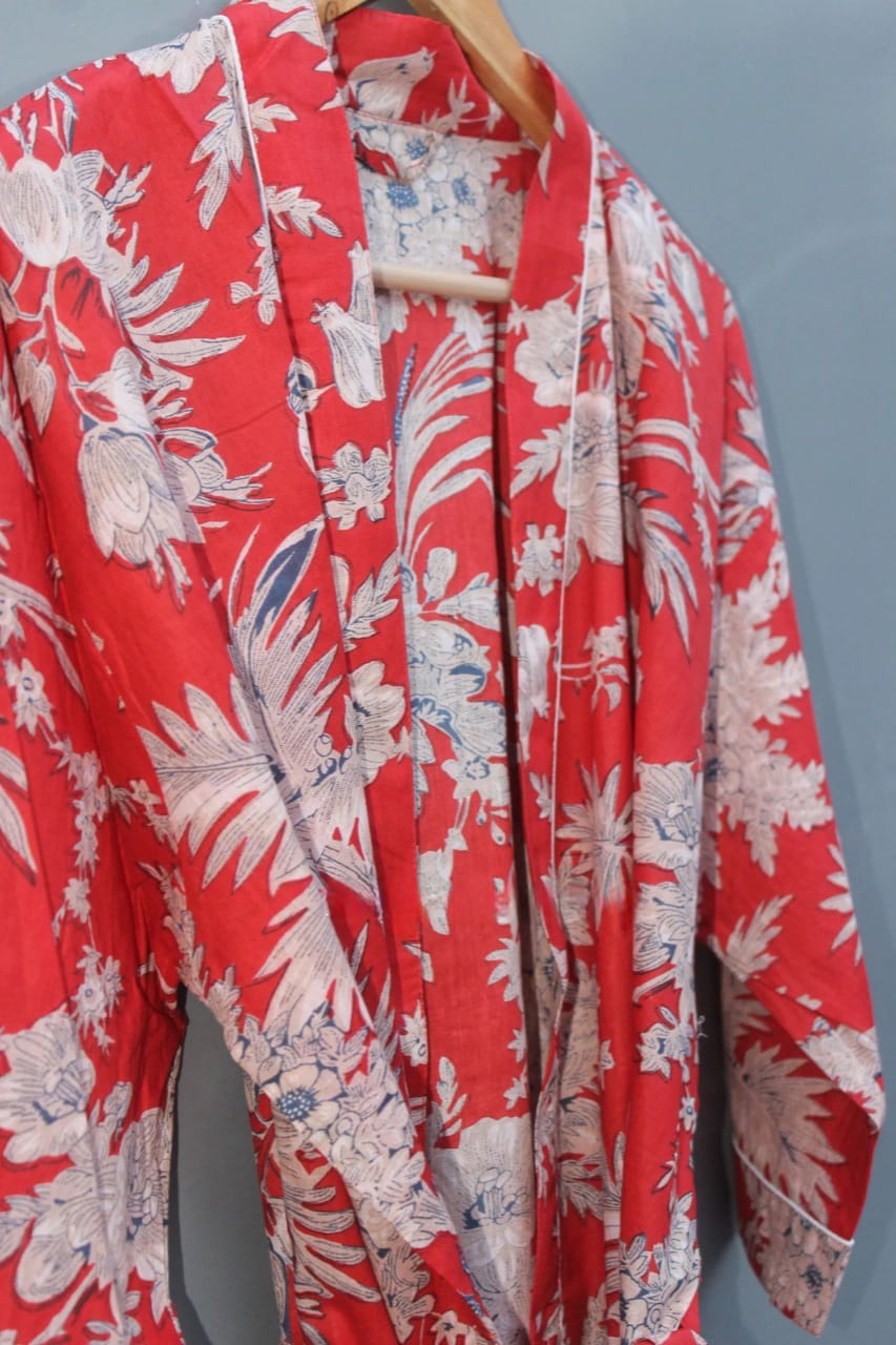 Red Floral Printed Cotton Kimono Indian Boho Robe Summer Dress Beach Coverup
