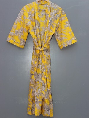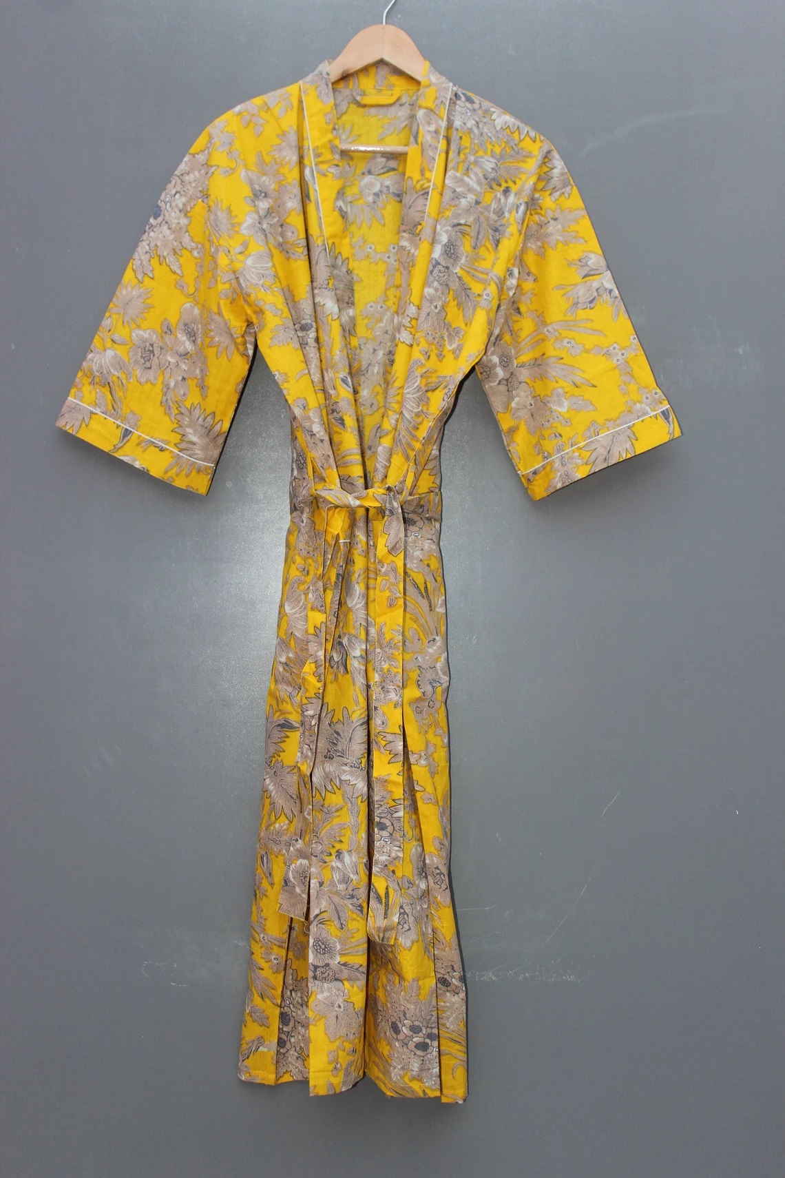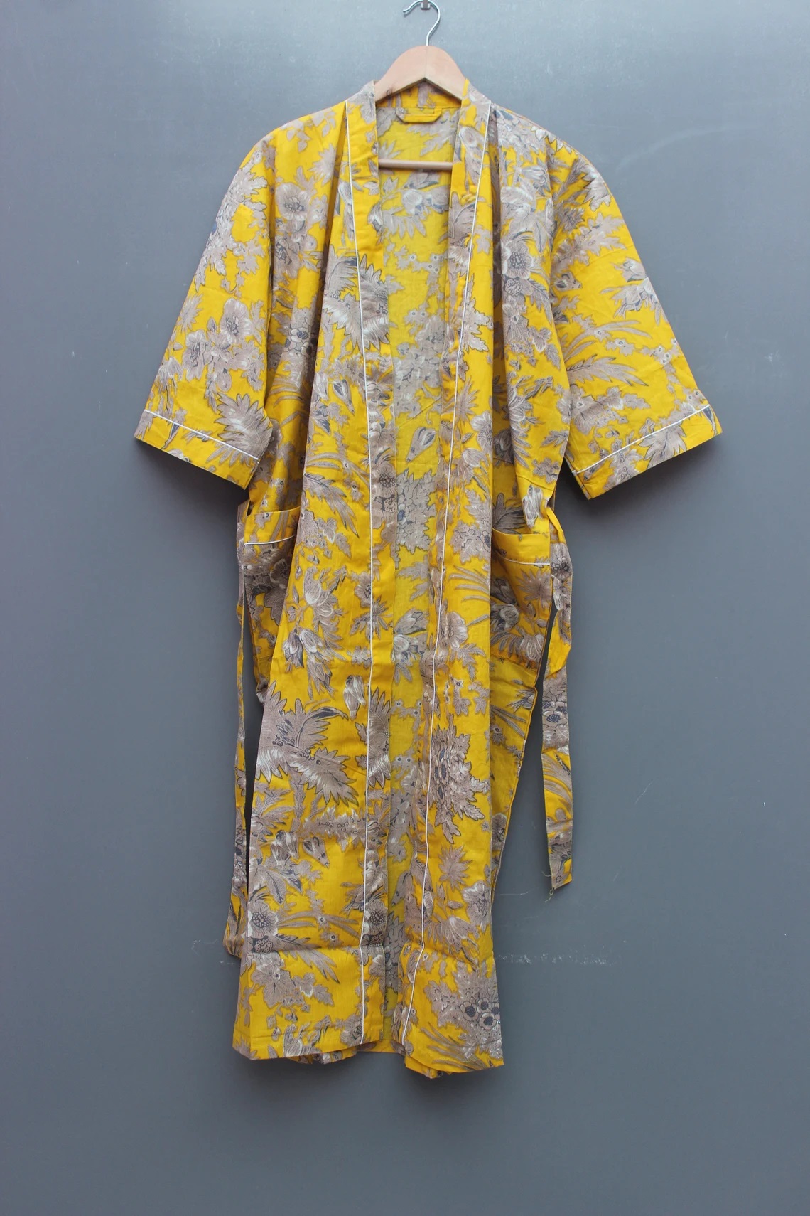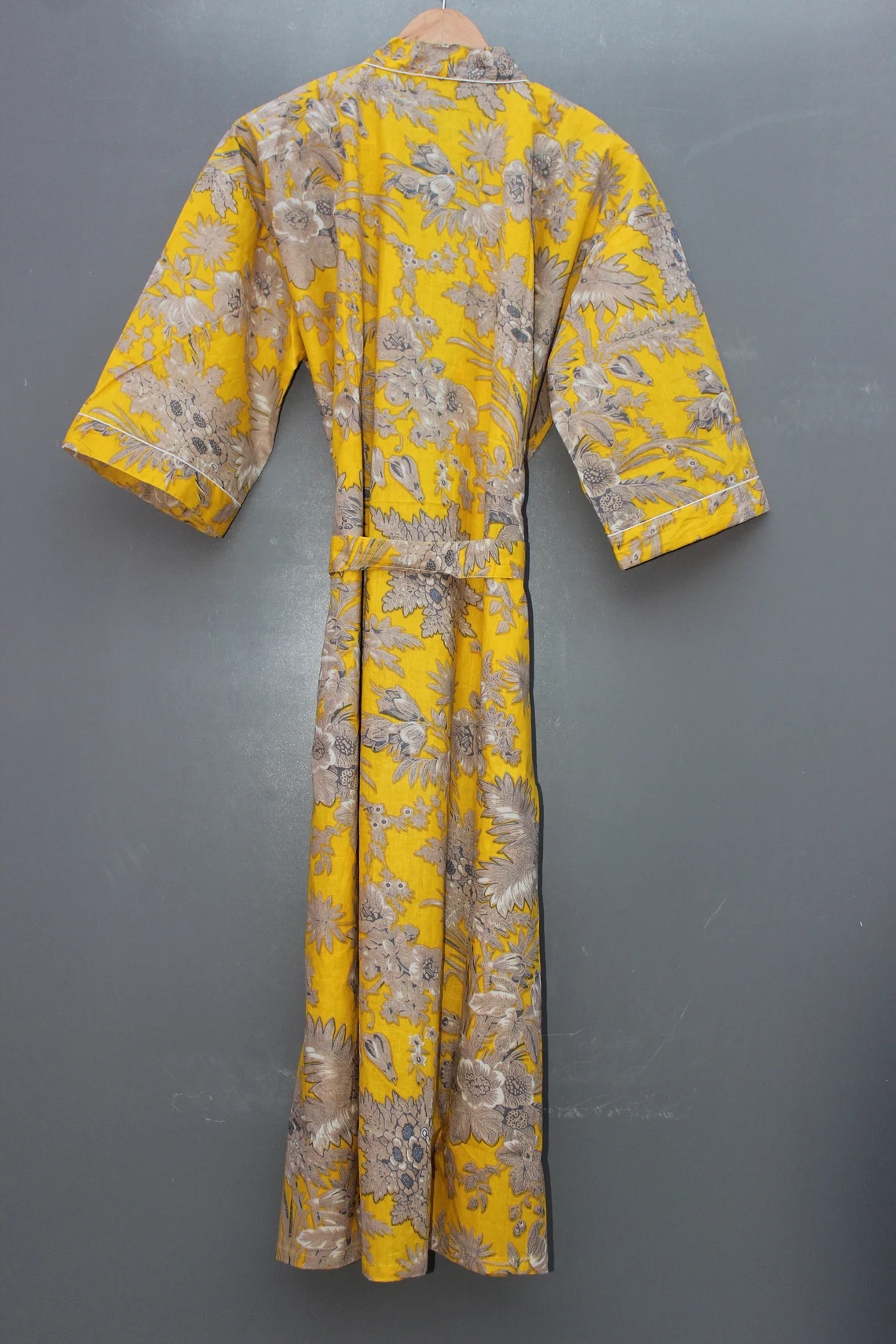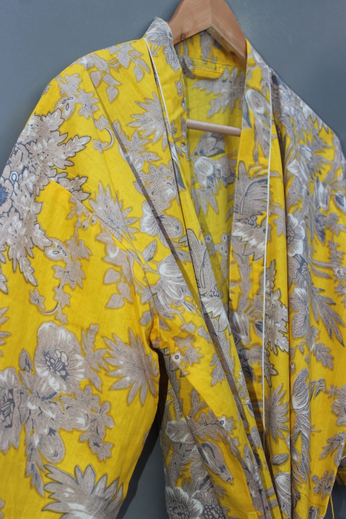 Yellow Floral Printed Cotton Kimono Indian Boho Robe Summer Dress Beach Coverup