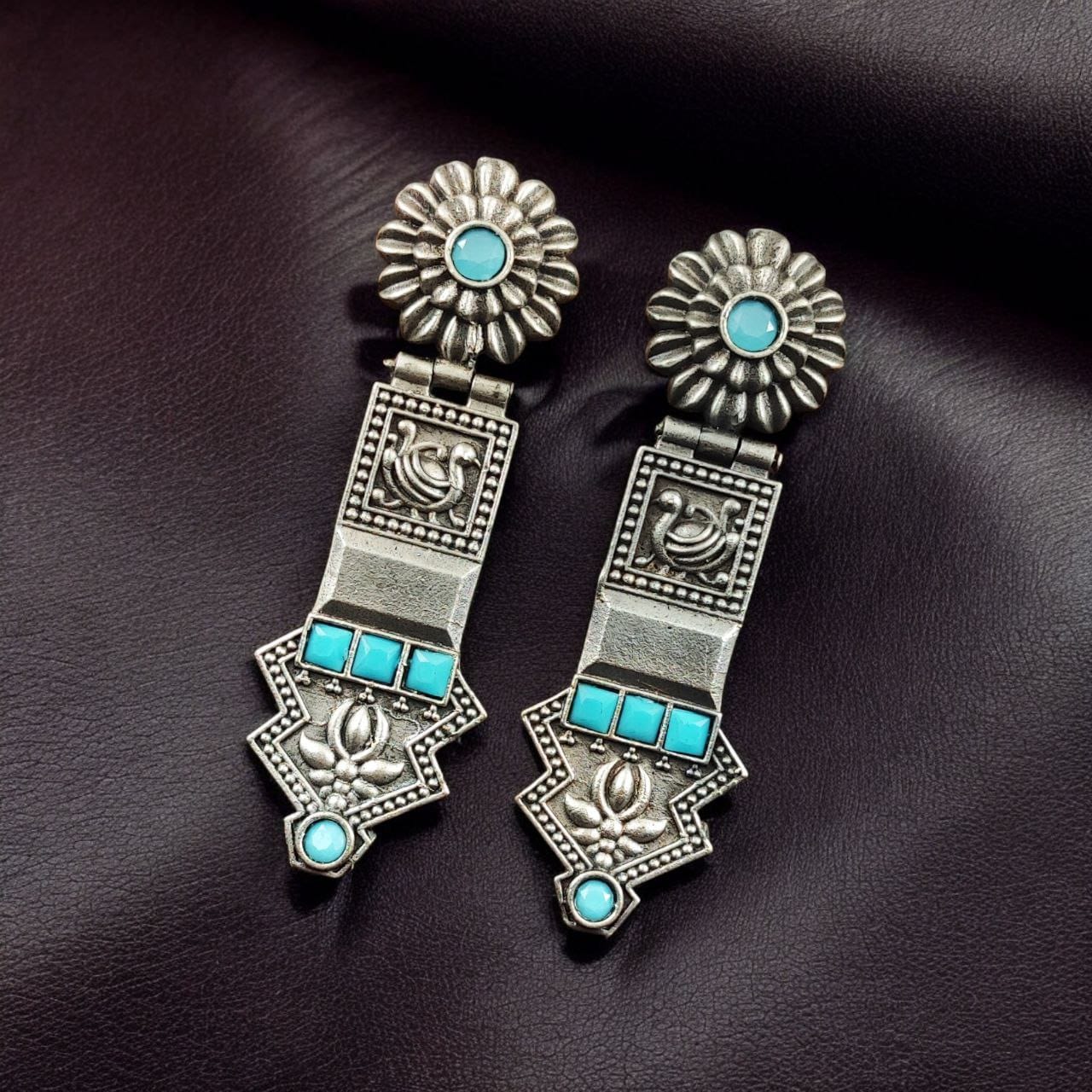 Blue Unique Rustic Brass Stud Earring Silver Oxidised Bollywood Earring Set for Women