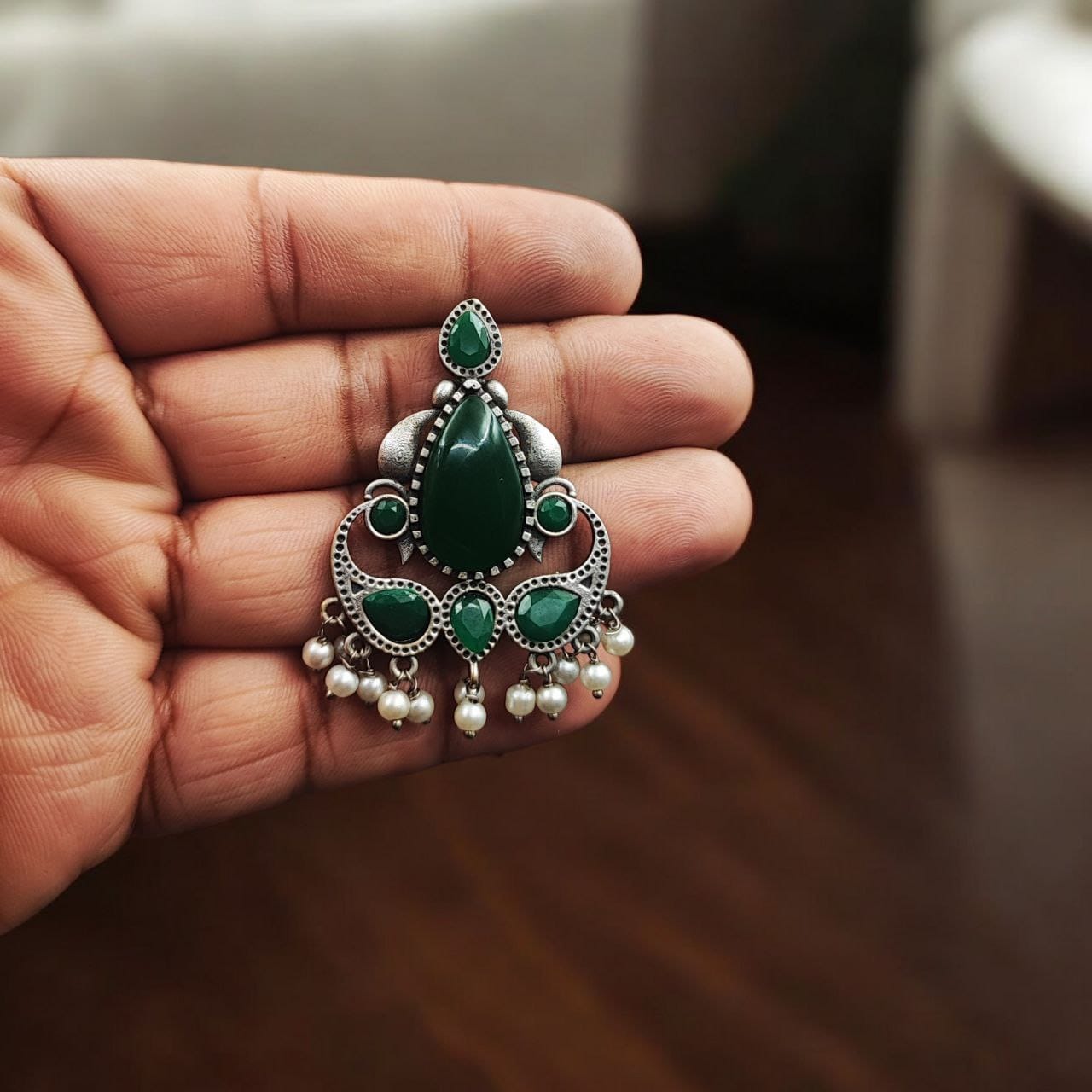 Green Premium Quality Ethnic Indian Brass Stud Earring Silver Oxidised Pearl Beads Drop