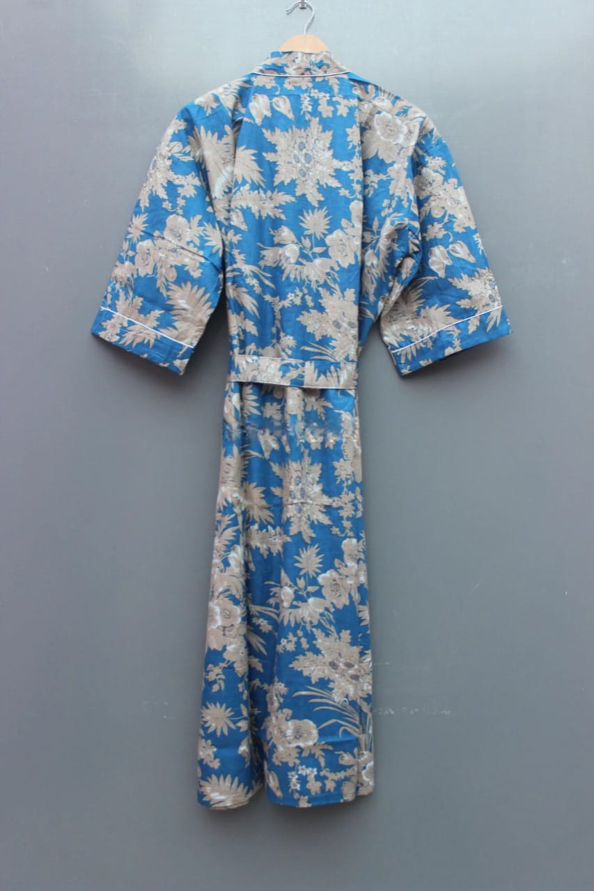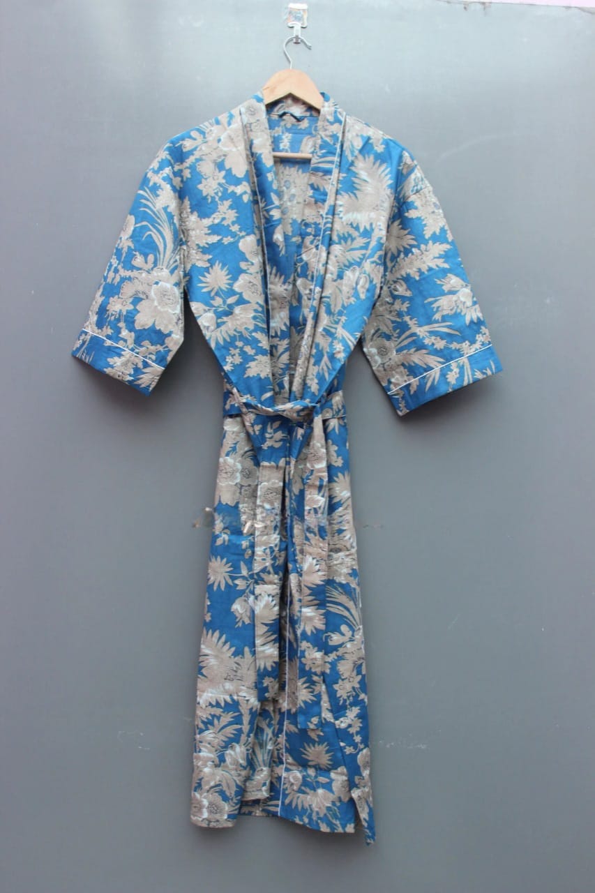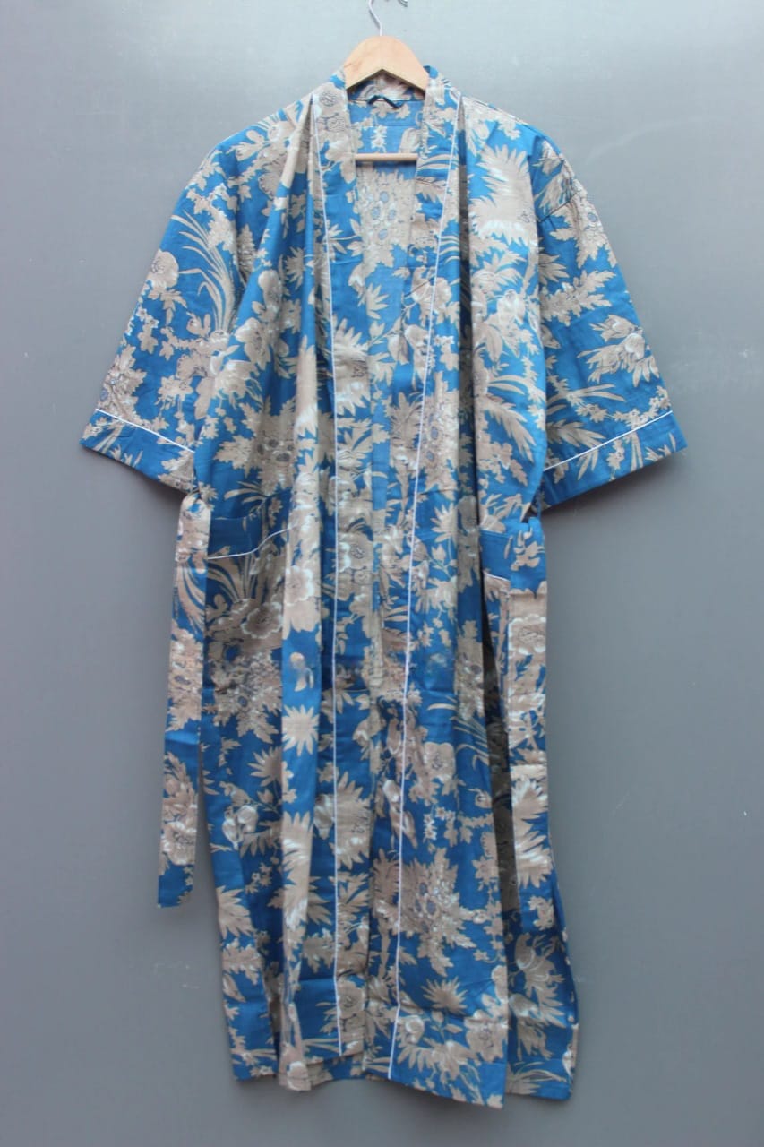 Blue Floral Printed Cotton Kimono Indian Boho Robe Summer Dress Beach Coverup