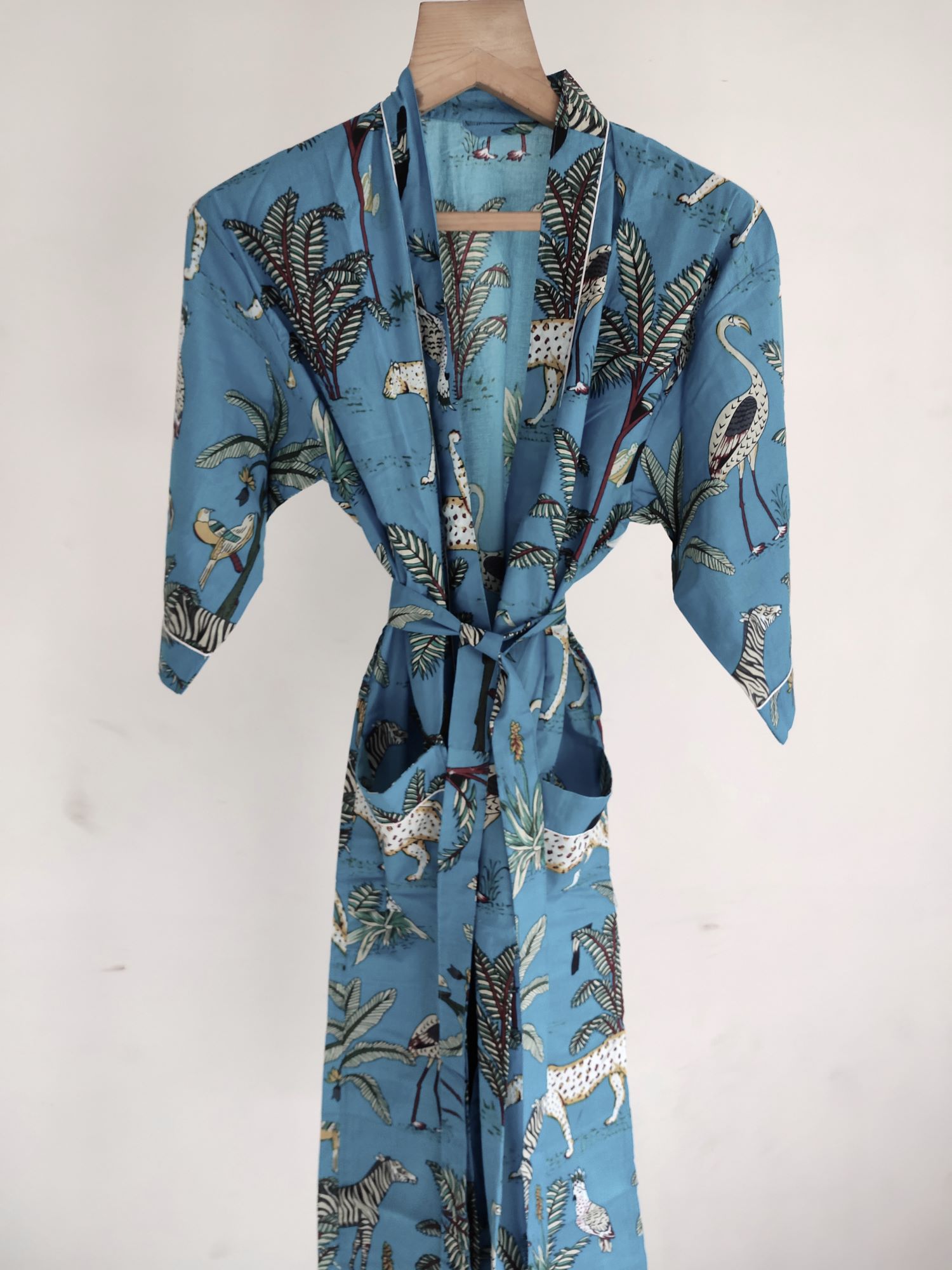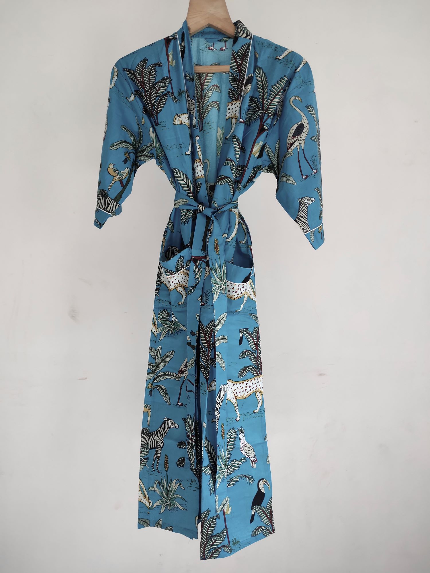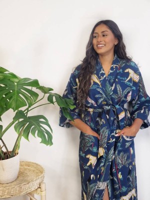 Cotton Kimono robes are perfect for lounging around the home or spa. Use our floral patchwork print robe as a cover up on the beach or after a dip in the pool. Add a luxury and boho feel to your bridal shower. Versatile, soft and luxurious, our 100% cotton kimono robes are printed with natural free dyes.