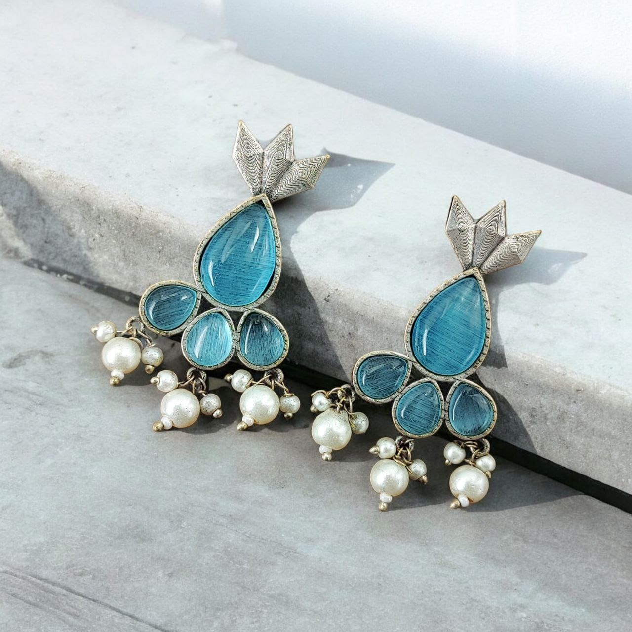 Aqua Attractive Traditional Indian Brass Monalisa Stone Stud Earring Silver Oxidised Jewellery Gift for Her