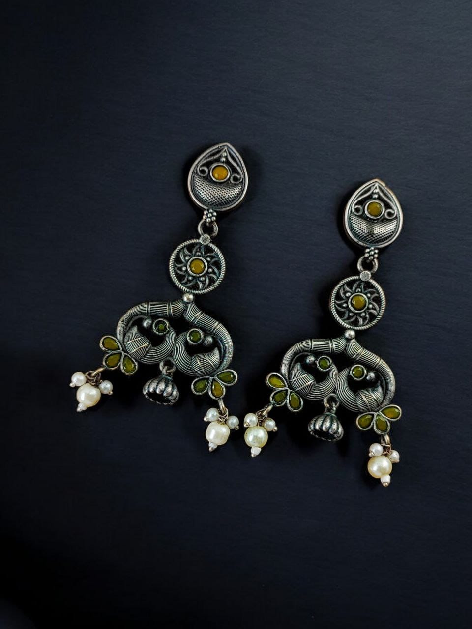 Yellow Antique Peacock Designer Brass Dangler Earring Silver Oxidised Bollywood Earring Jhumki Set