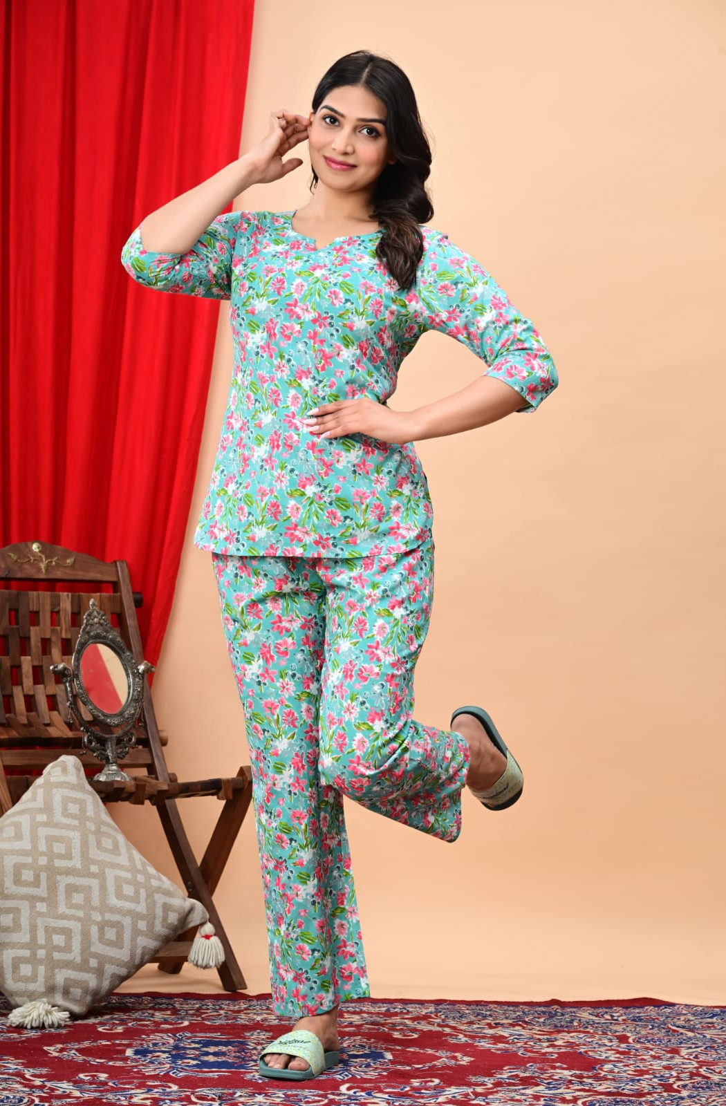 Upgrade your bedtime wardrobe with our Turquoise Sanganeri Booty Print Lounge Wear Set. This night suit features an elegant sanganeri booty print and is crafted for utmost comfort and style. The matching pyjama co-ord set ensures a cohesive, chic look while lounging or sleeping. Made from soft, breathable fabric, it's perfect for a restful night's sleep. Ideal for women who appreciate both comfort and fashion, this lounge wear set is a must-have for any nightwear collection. 😴🌸