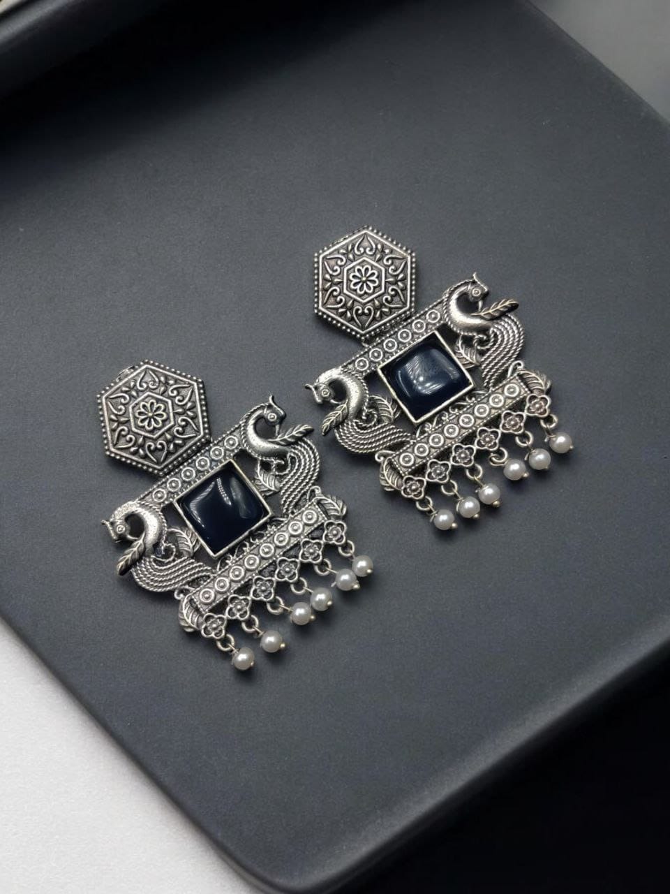 Blue Indian Traditional Rustic Peacock Monalisa Stone Dangler Earring Silver Oxidised Pearl Beads Drop Earring Set