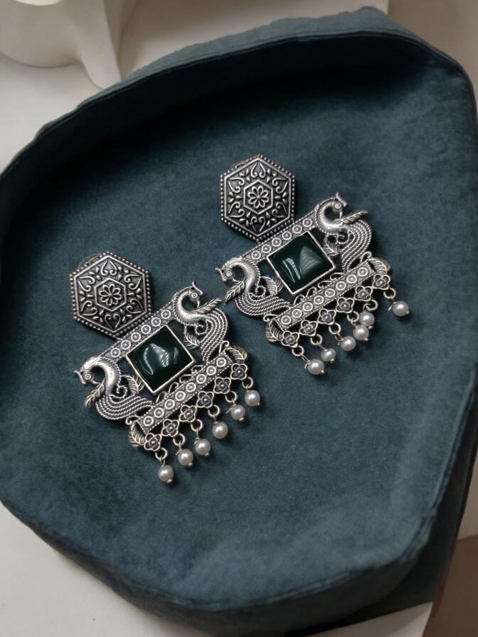 Green Indian Traditional Rustic Peacock Monalisa Stone Dangler Earring Silver Oxidised Pearl Beads Drop Earring Set