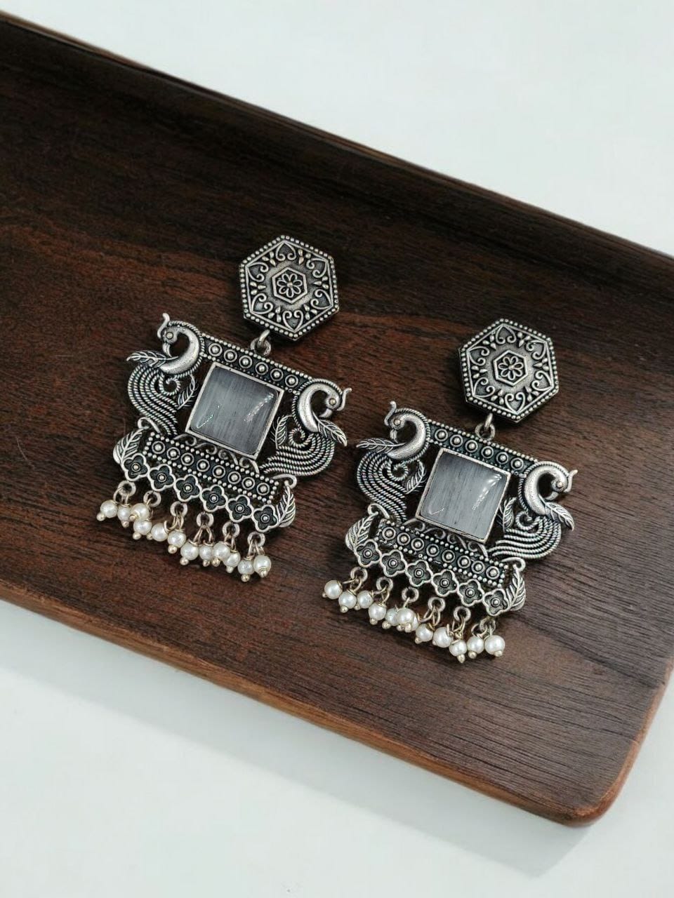 Grey Indian Traditional Rustic Peacock Monalisa Stone Dangler Earring Silver Oxidised Pearl Beads Drop Earring Set