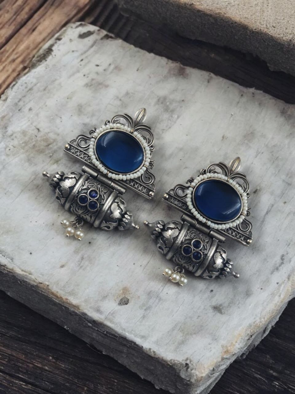 Blue Traditional Indian Gypsy Designer Monalisa Stone Stud Earring Silver Oxidised Pearl Beads Earring Set