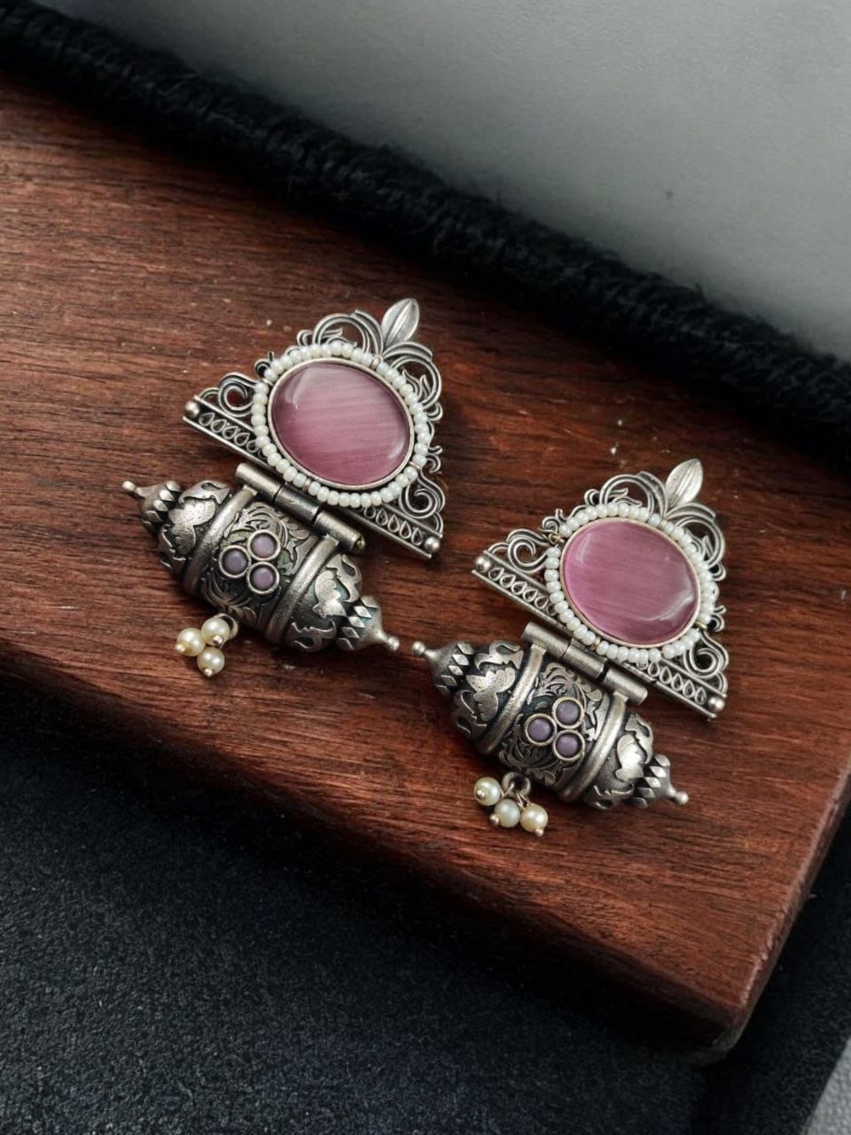 Babypink Traditional Indian Gypsy Designer Monalisa Stone Stud Earring Silver Oxidised Pearl Beads Earring Set