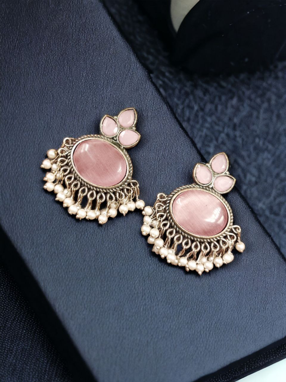Pink Attractive Brass Designer Monalisa Stone Stud Earring Silver Oxidised Pearl Beads Earring Set