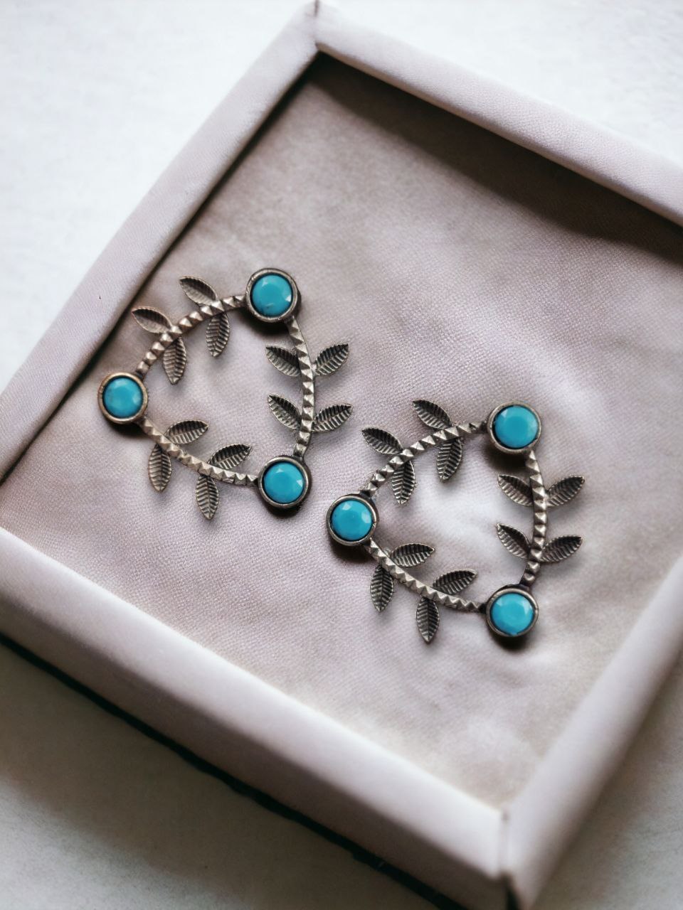 Aqua Antique Designer Leaf Pattered Stone Work Brass Stud Earring Gift for Her