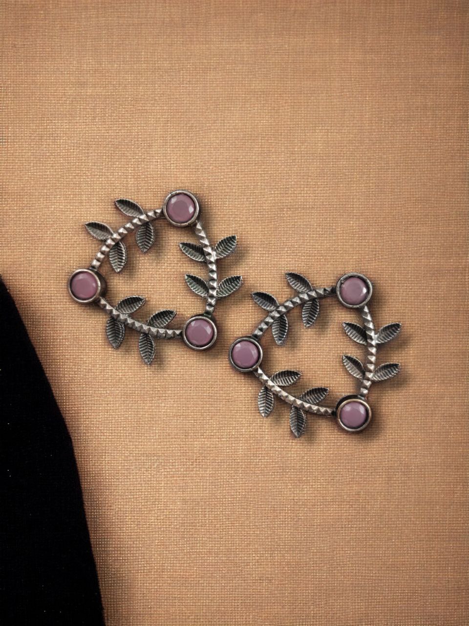 Babypink Antique Designer Leaf Pattered Stone Work Brass Stud Earring Gift for Her