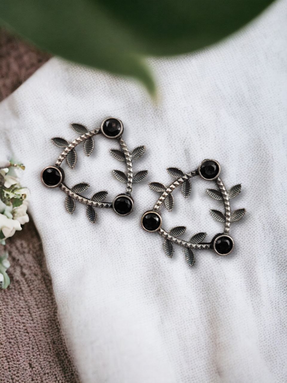 Black Antique Designer Leaf Pattered Stone Work Brass Stud Earring Gift for Her