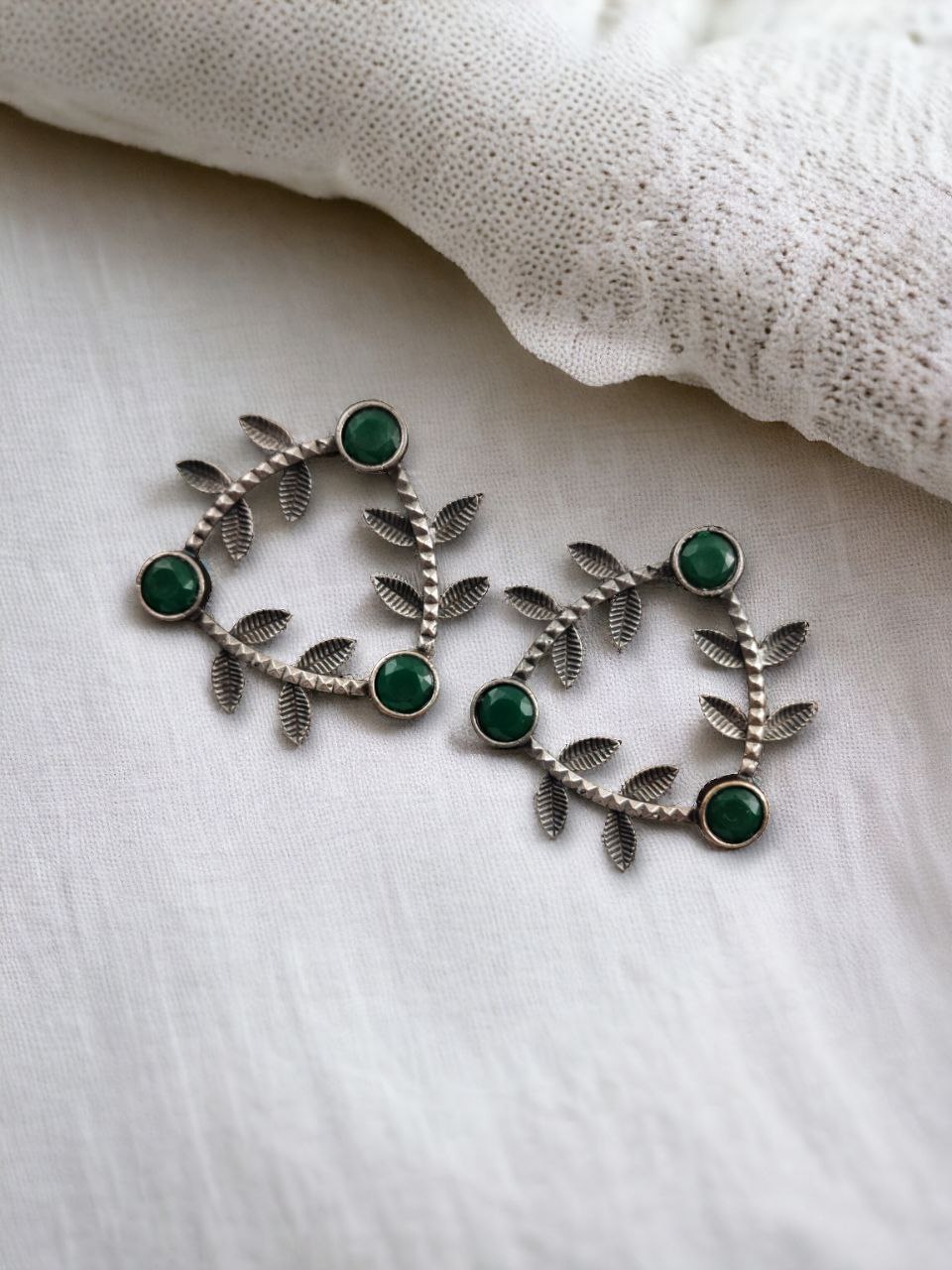 Green Antique Designer Leaf Pattered Stone Work Brass Stud Earring Gift for Her