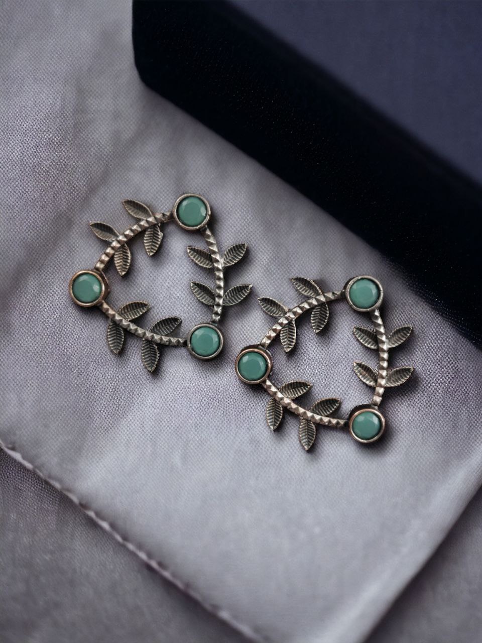 Mint Antique Designer Leaf Pattered Stone Work Brass Stud Earring Gift for Her