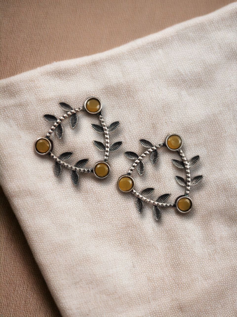 Yellow Antique Designer Leaf Pattered Stone Work Brass Stud Earring Gift for Her