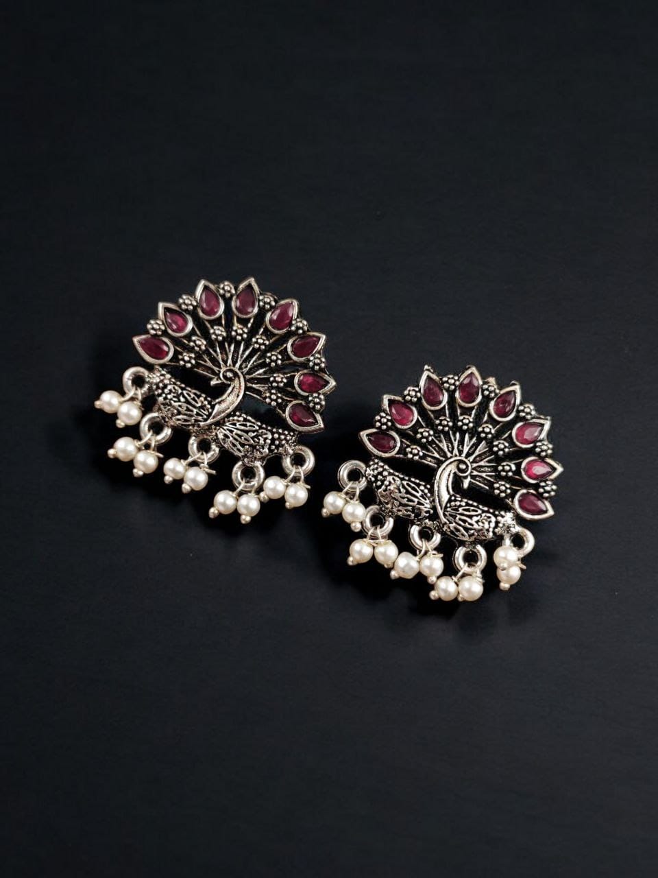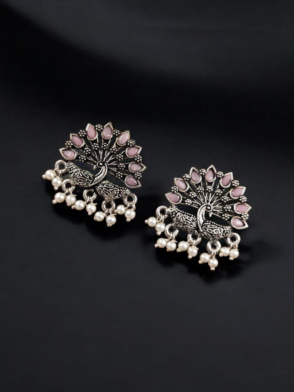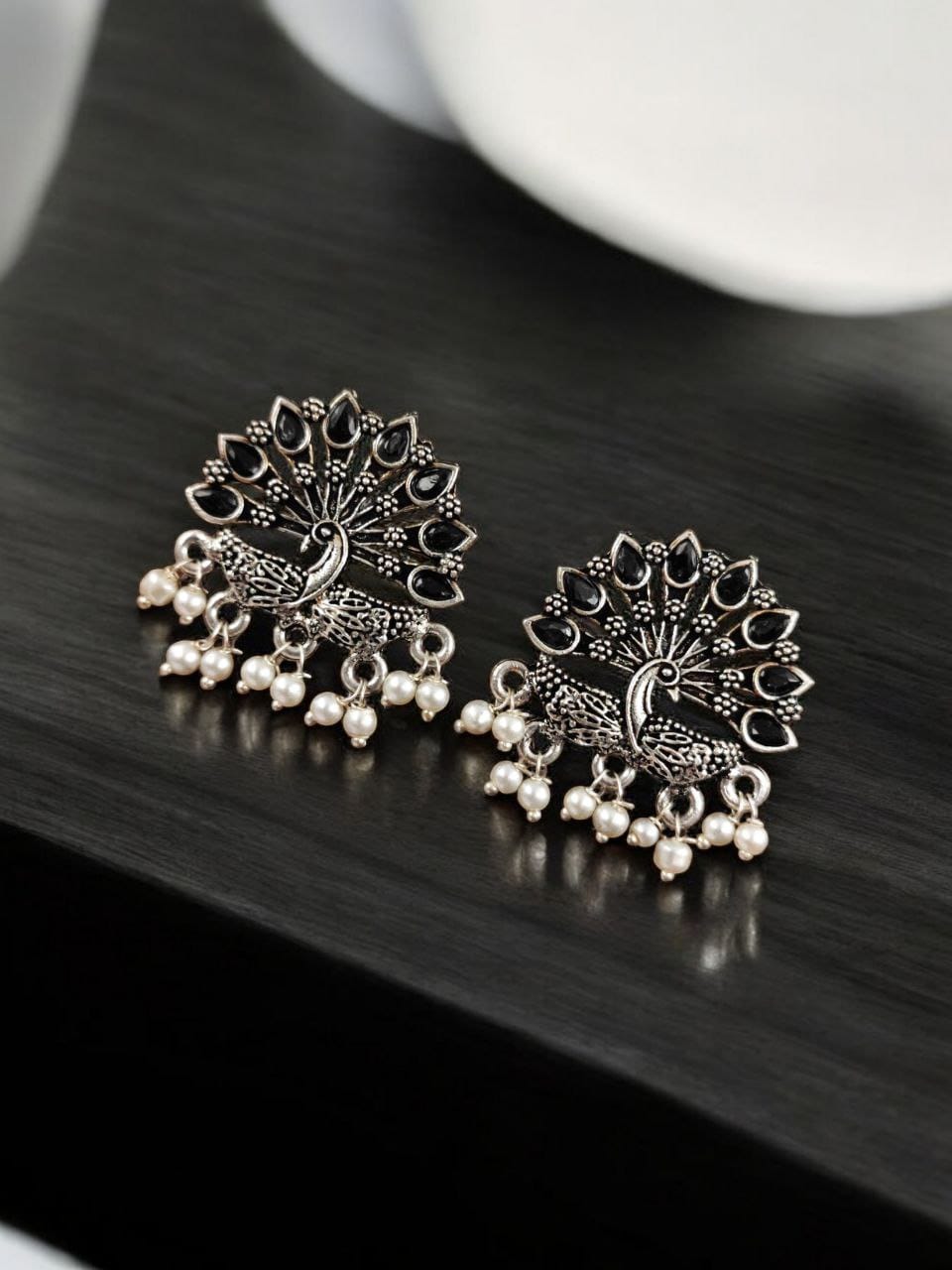 Black Exquisite Peacock Designer Hand Crafted Stone Work Brass Stud Earring Pearl Beads Drop Gift for Her