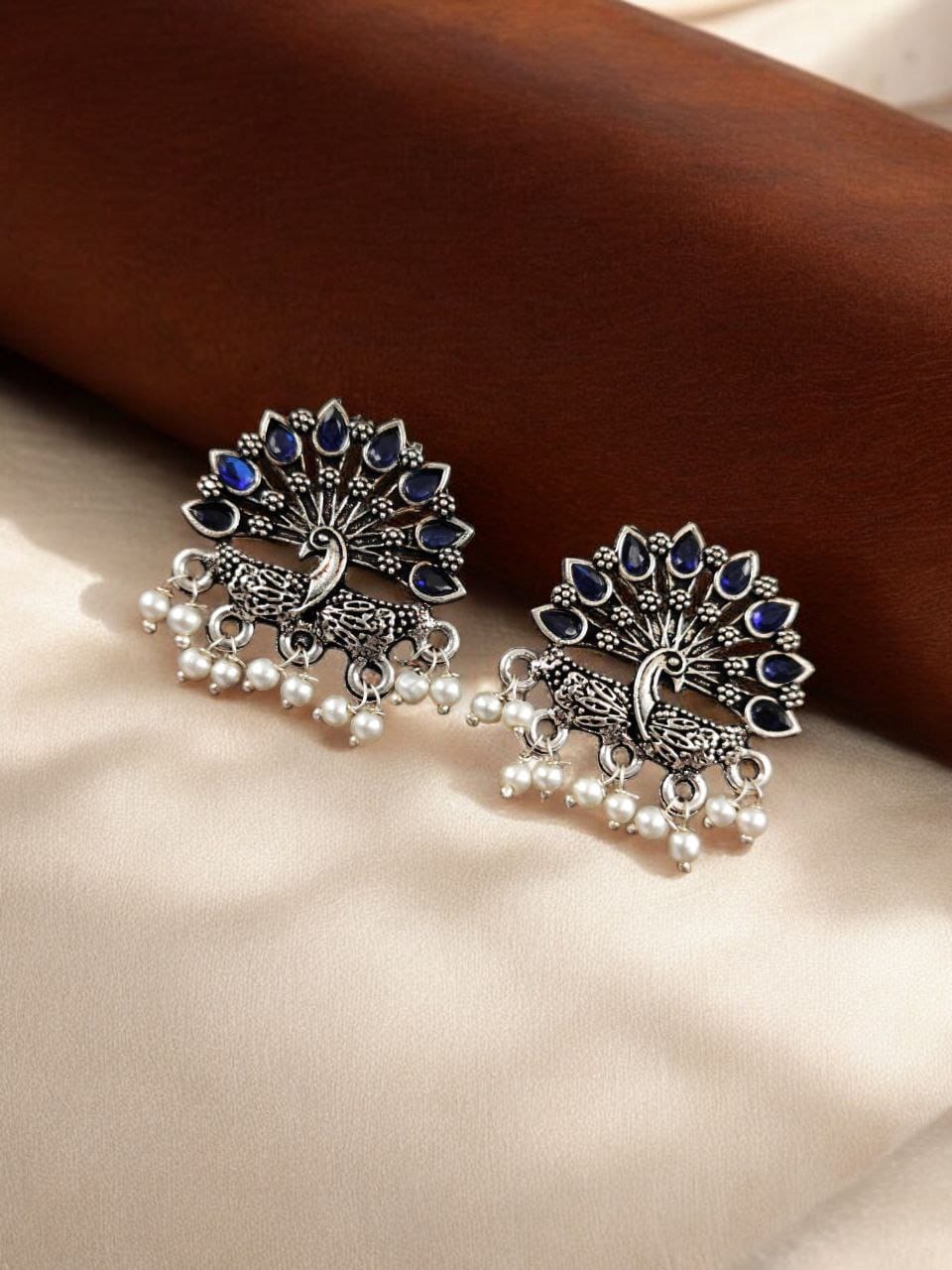 Blue Exquisite Peacock Designer Hand Crafted Stone Work Brass Stud Earring Pearl Beads Drop Gift for Her
