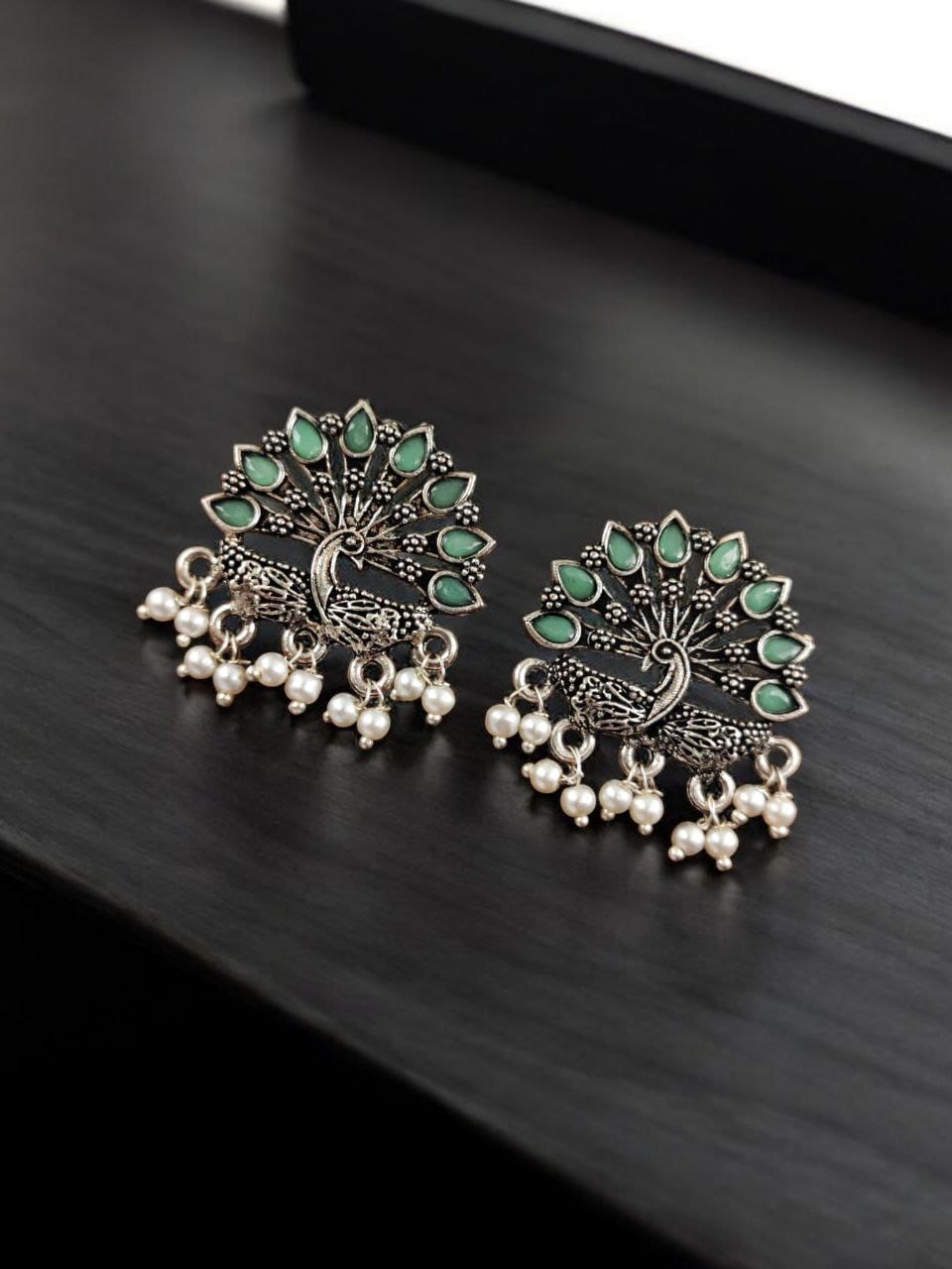 Mint Exquisite Peacock Designer Hand Crafted Stone Work Brass Stud Earring Pearl Beads Drop Gift for Her