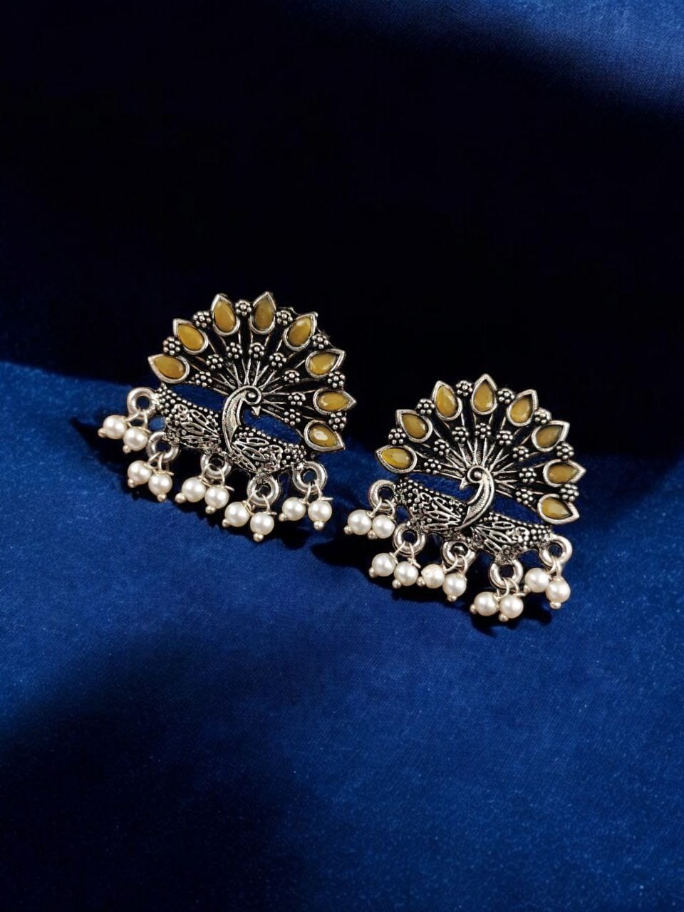 Yellow Exquisite Peacock Designer Hand Crafted Stone Work Brass Stud Earring Pearl Beads Drop Gift for Her