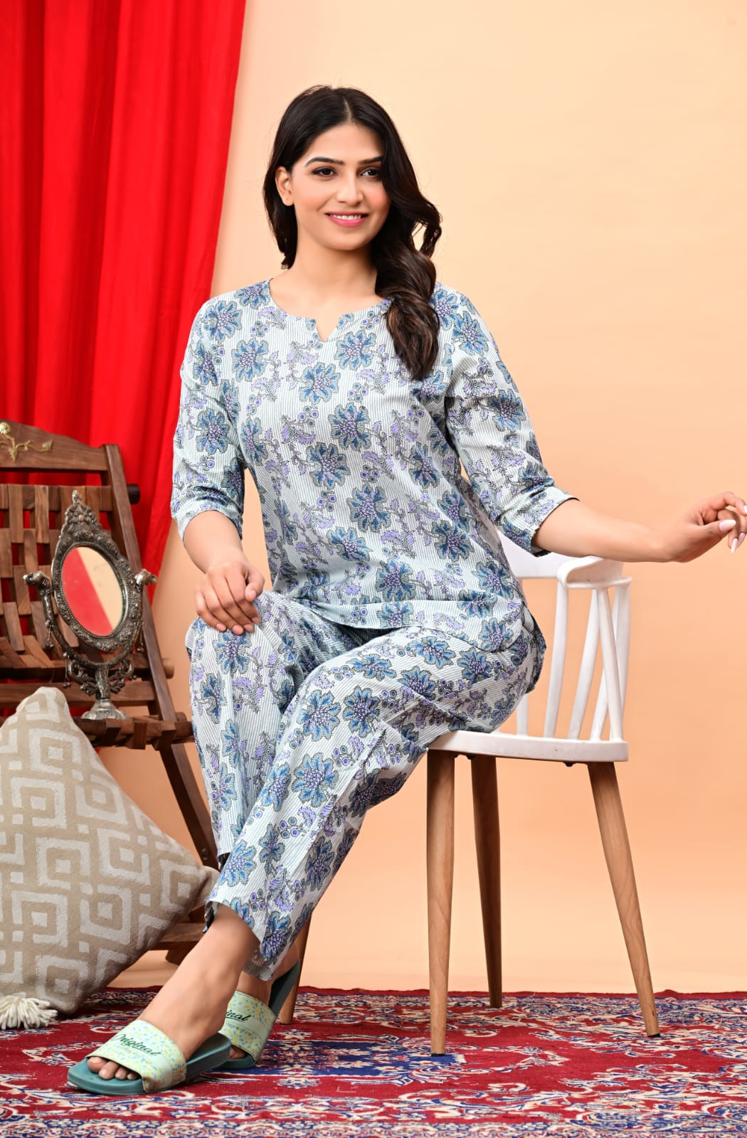 Upgrade your bedtime wardrobe with our White Striped Floral Print Lounge Wear Set. This night suit features an elegant floral print and is crafted for utmost comfort and style. The matching pyjama co-ord set ensures a cohesive, chic look while lounging or sleeping. Made from soft, breathable fabric, it's perfect for a restful night's sleep. Ideal for women who appreciate both comfort and fashion, this lounge wear set is a must-have for any nightwear collection. 😴🌸