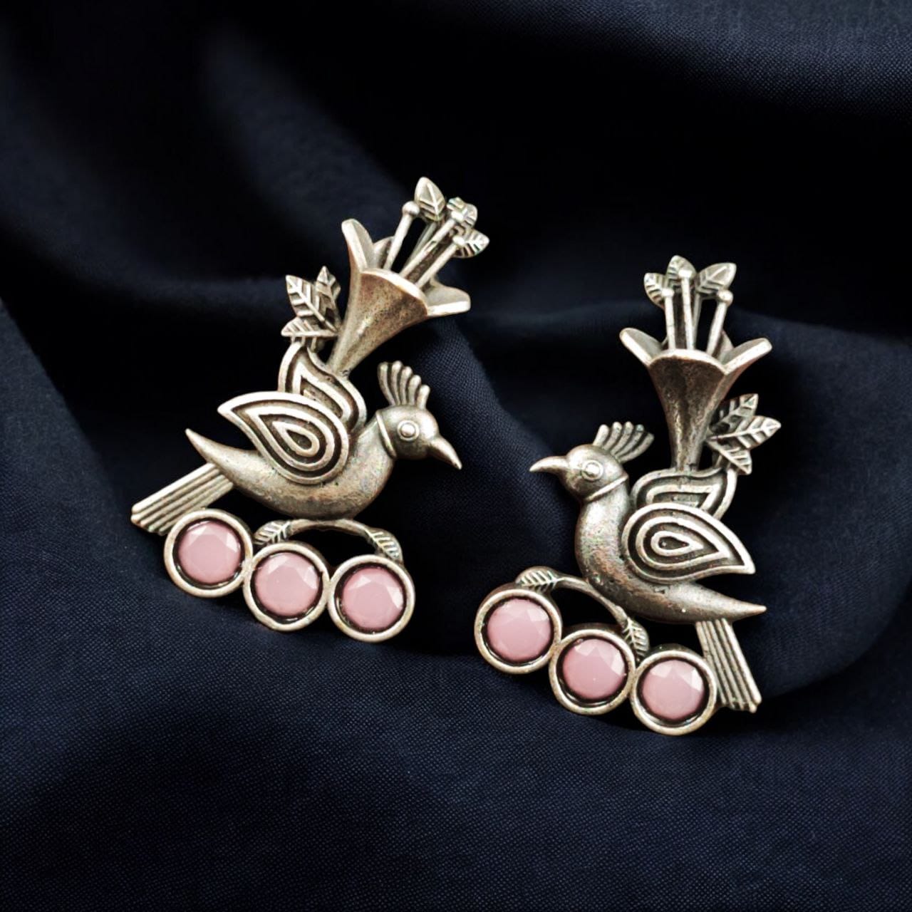 Pink Gorgeous Designer Bird Stone Work Brass Stud Earring Gift for Her