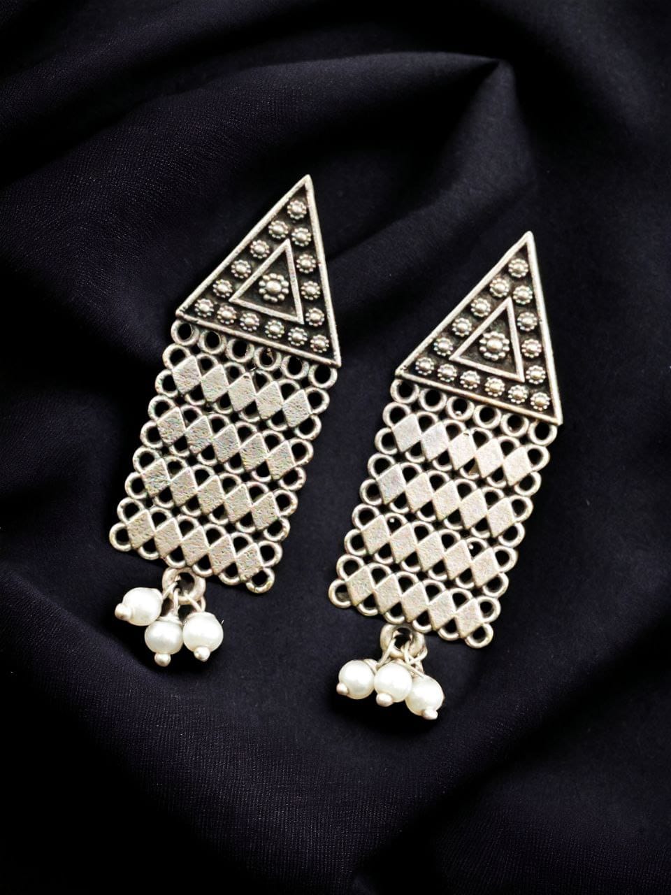Beautiful Triangle Shaped Contemporary Designer Stud Earring Silver Oxidised Pearl Beads Drop Earring