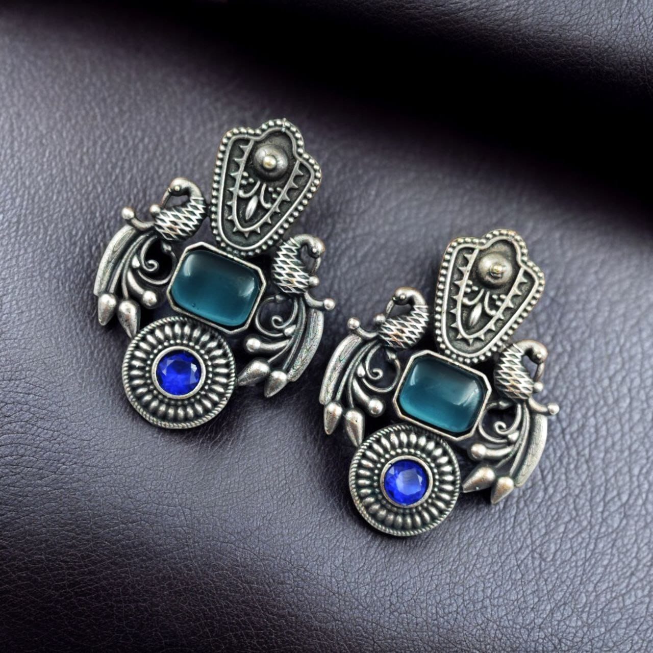 Blue Traditional Indian Peacock Brass Monalisa Stone Stud Earring Designer Silver Oxidised Earring Set