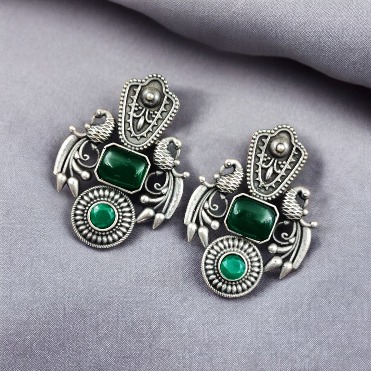 Green Traditional Indian Peacock Brass Monalisa Stone Stud Earring Designer Silver Oxidised Earring Set