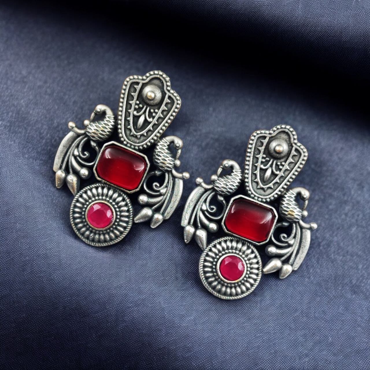 Red Traditional Indian Peacock Brass Monalisa Stone Stud Earring Designer Silver Oxidised Earring Set