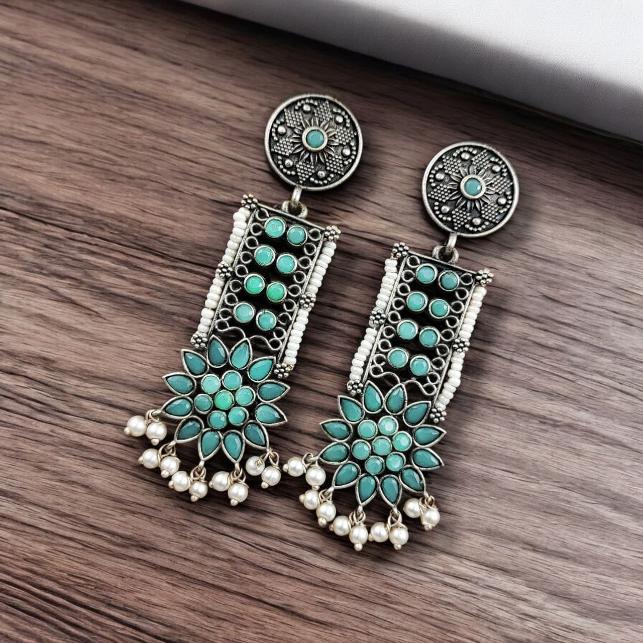 Mint Stunning Indian Handcrafted Stone Work Dangler Earring Silver Oxidised Pearl Beads Drop Earring Set