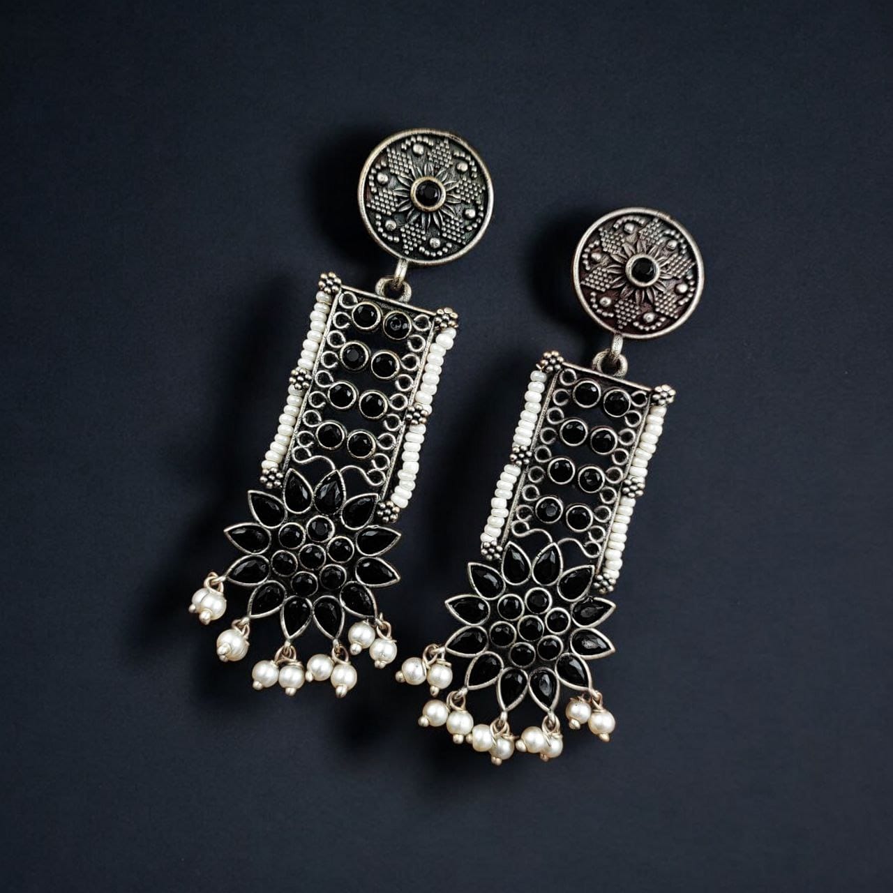Black Stunning Indian Handcrafted Stone Work Dangler Earring Silver Oxidised Pearl Beads Drop Earring Set