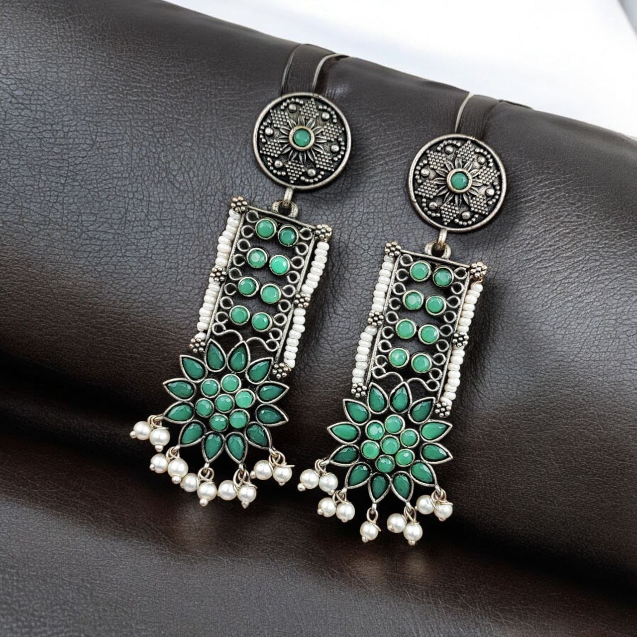 Green Stunning Indian Handcrafted Stone Work Dangler Earring Silver Oxidised Pearl Beads Drop Earring Set