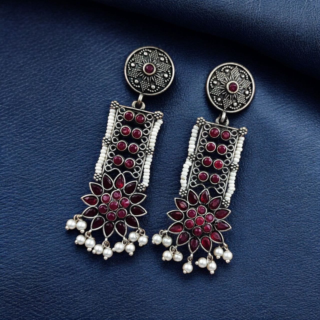 Red Stunning Indian Handcrafted Stone Work Dangler Earring Silver Oxidised Pearl Beads Drop Earring Set