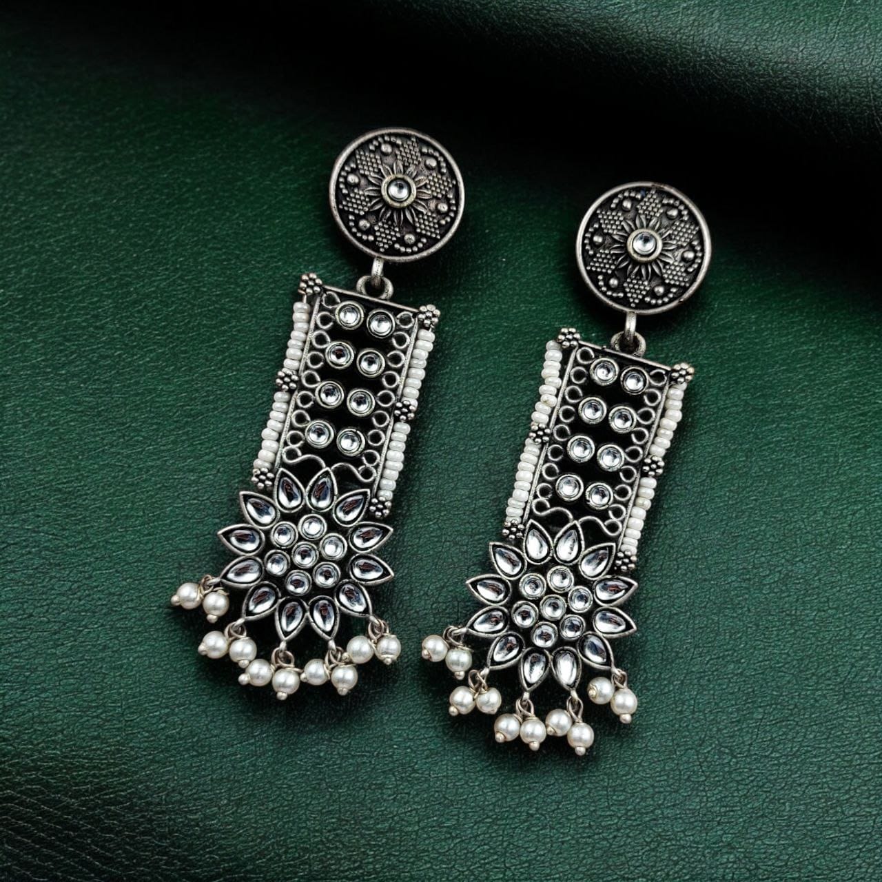 Stunning Indian Handcrafted Stone Work Dangler Earring Silver Oxidised Pearl Beads Drop Earring Set