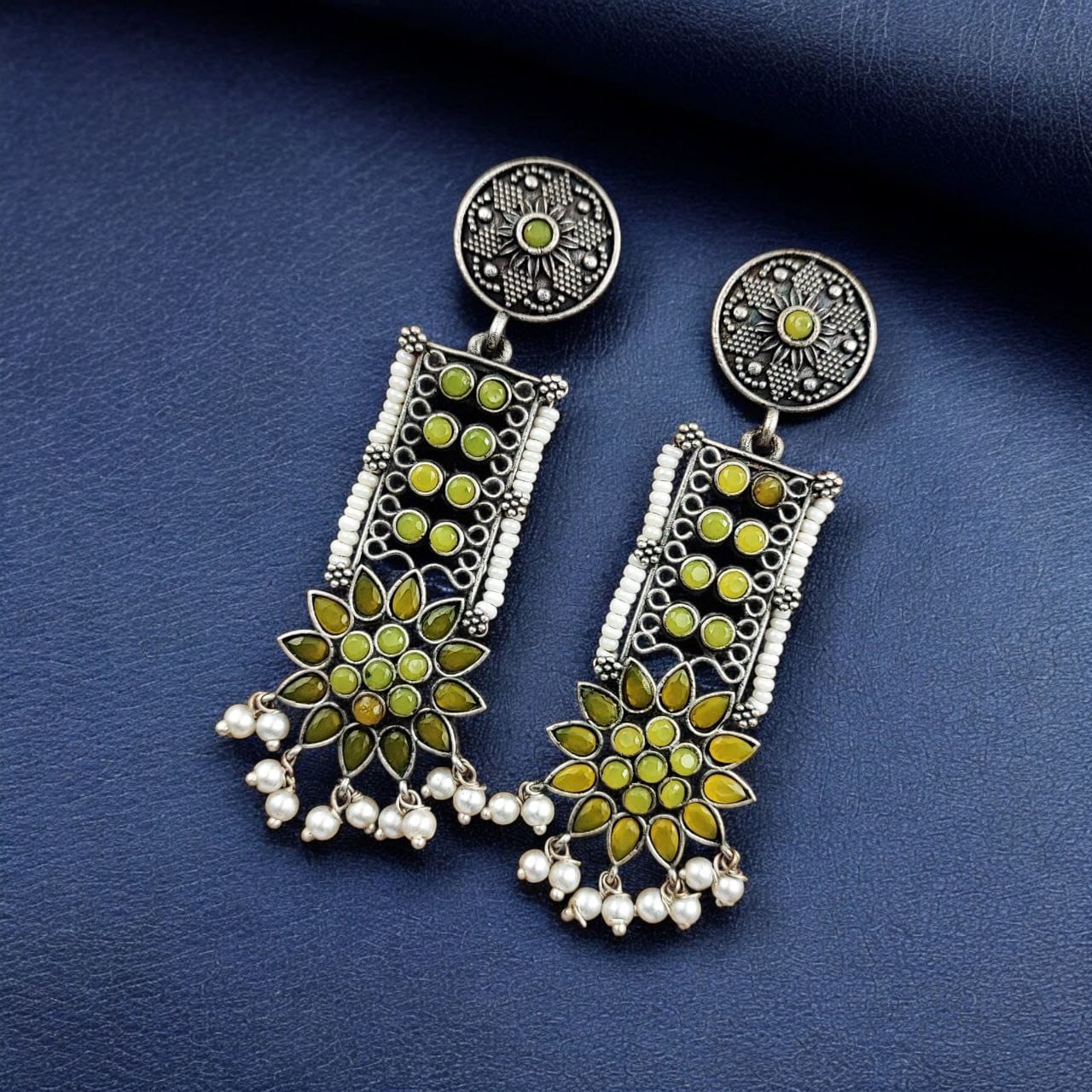Yellow Stunning Indian Handcrafted Stone Work Dangler Earring Silver Oxidised Pearl Beads Drop Earring Set