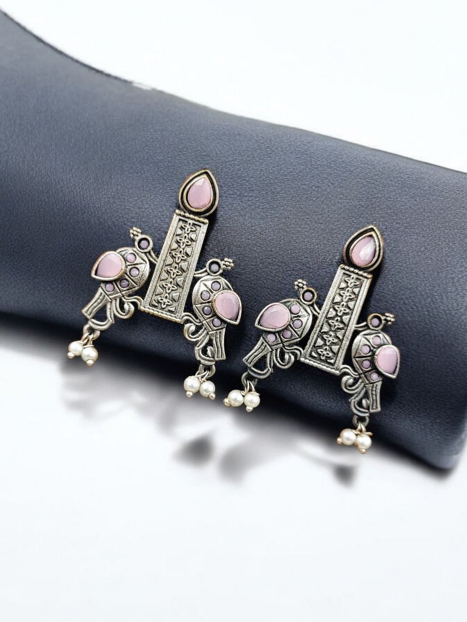 Pink Antique Traditional Bird Designer Brass Earring Set Stone Work Pearl Beads Drop Earring for Women