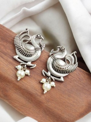 Special Half Circle Designer Brass Silver Oxidized Stud Earring Set with Pearl Beads Drop