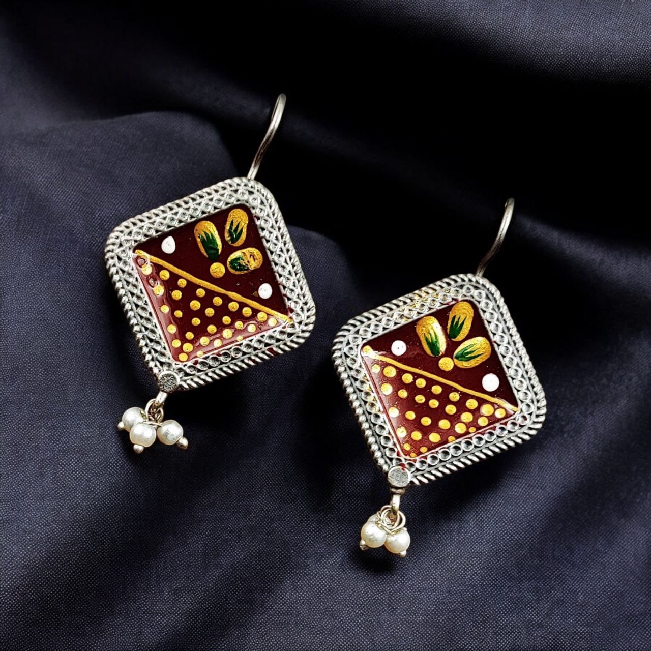 Maroon Beautiful Art Handcrafted Painted Hook Earring Silver Replica Handmade Pearl Beads Drop Earring