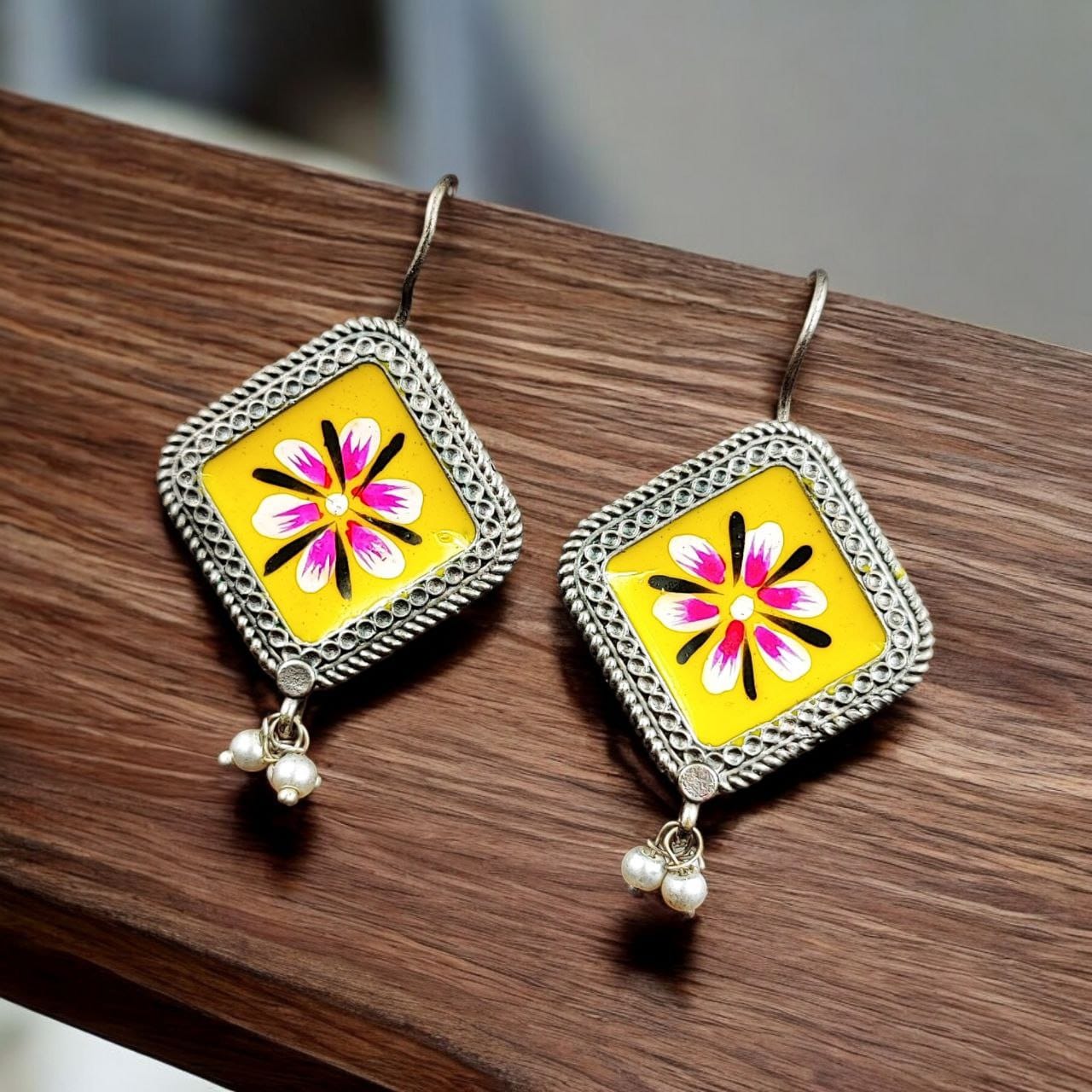 Yellow Beautiful Art Handcrafted Painted Hook Earring Silver Replica Handmade Pearl Beads Drop Earring