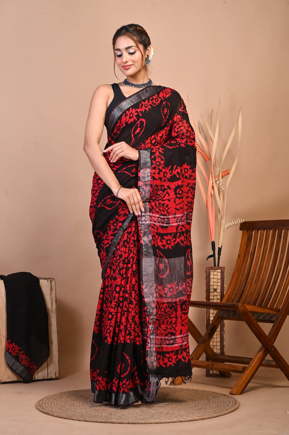 Add a touch of sophistication to your wardrobe with our Hand Block Printed Linen Cotton Saree. This 5.5-meter saree is crafted with intricate hand block prints, exuding traditional charm. Paired with a 1-meter unstitched blouse piece, it offers ample customization options. The luxurious linen-cotton blend ensures both comfort and style, making it perfect for any occasion. Elevate your ethnic wear collection with this timeless piece of elegance.