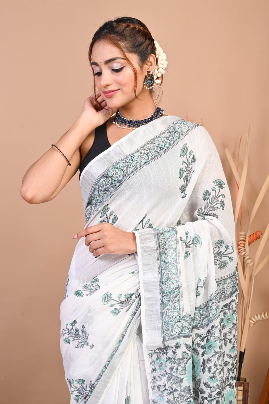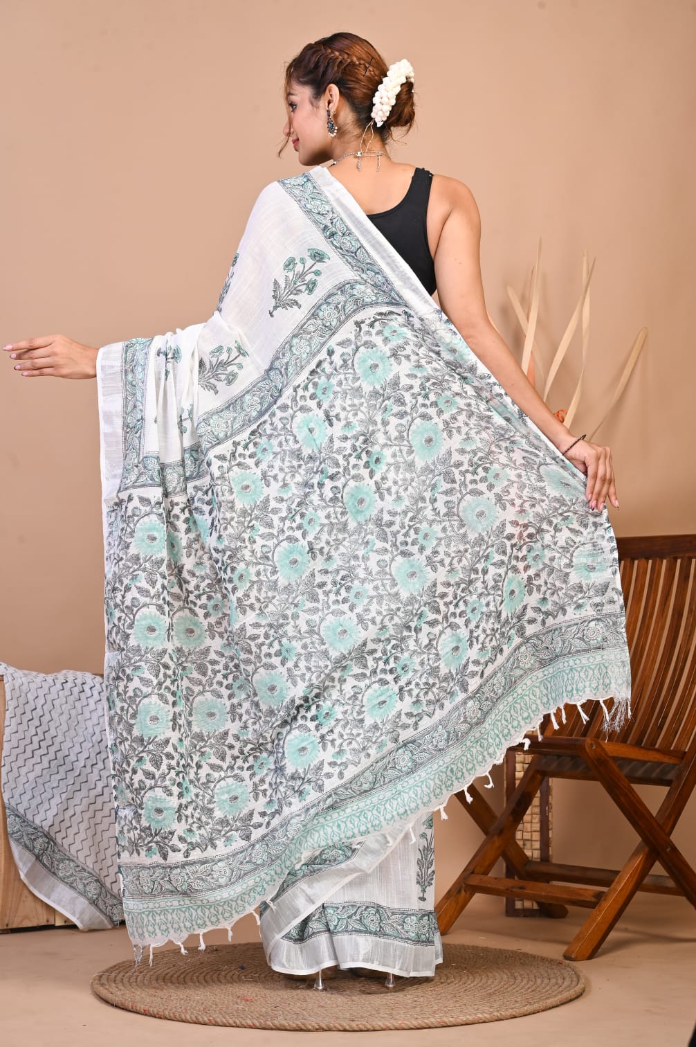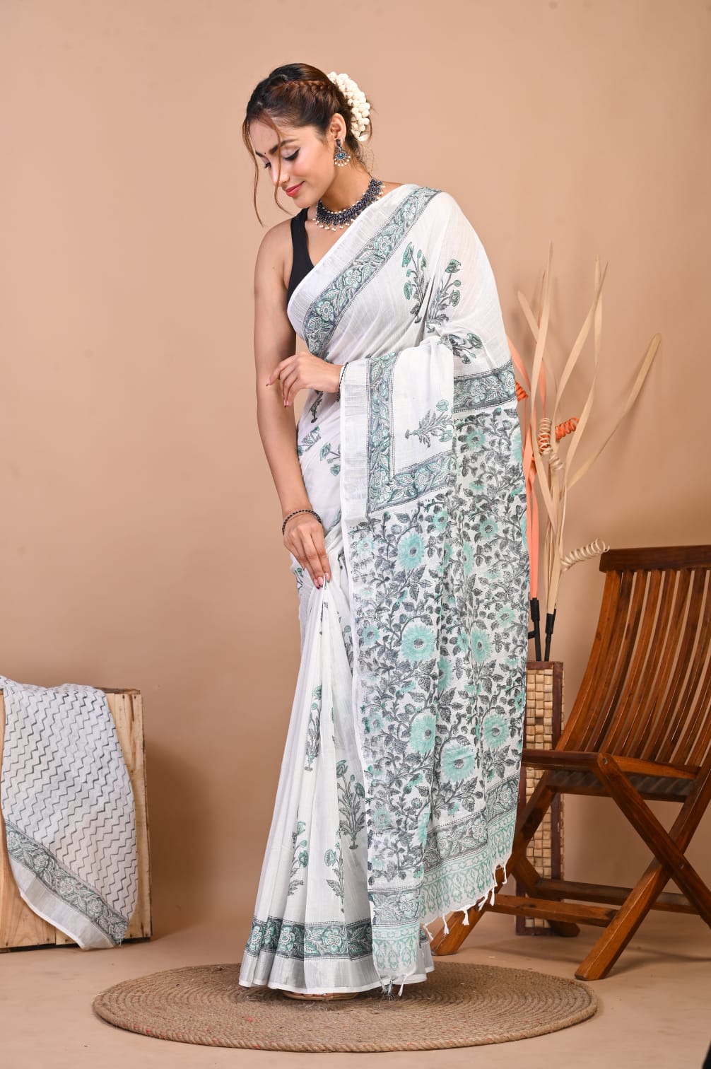 Add a touch of sophistication to your wardrobe with our Hand Block Printed Linen Cotton Saree. This 5.5-meter saree is crafted with intricate hand block prints, exuding traditional charm. Paired with a 1-meter unstitched blouse piece, it offers ample customization options. The luxurious linen-cotton blend ensures both comfort and style, making it perfect for any occasion. Elevate your ethnic wear collection with this timeless piece of elegance.