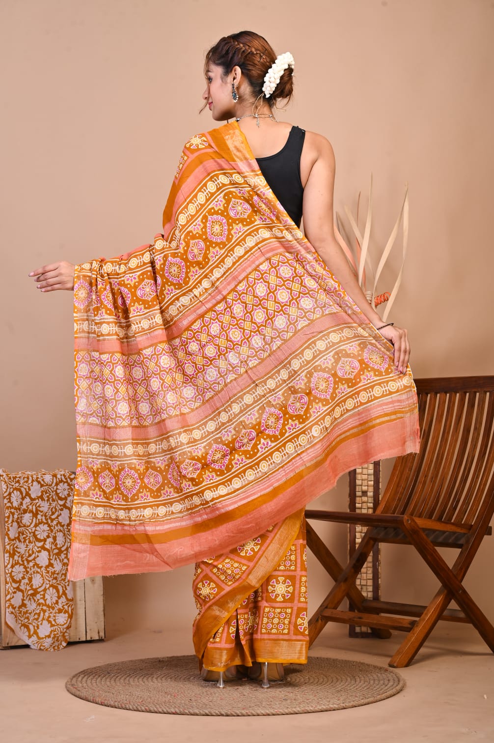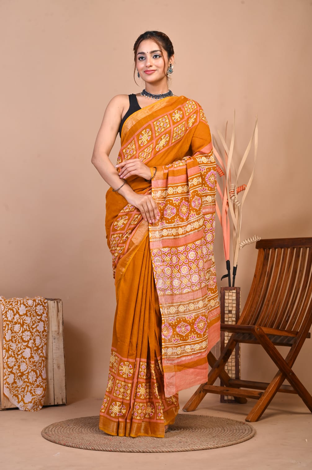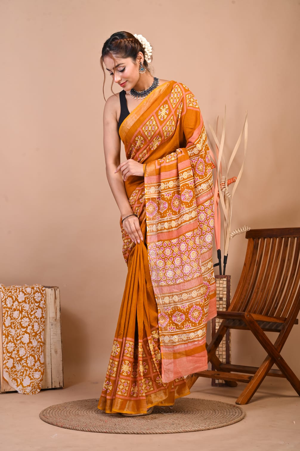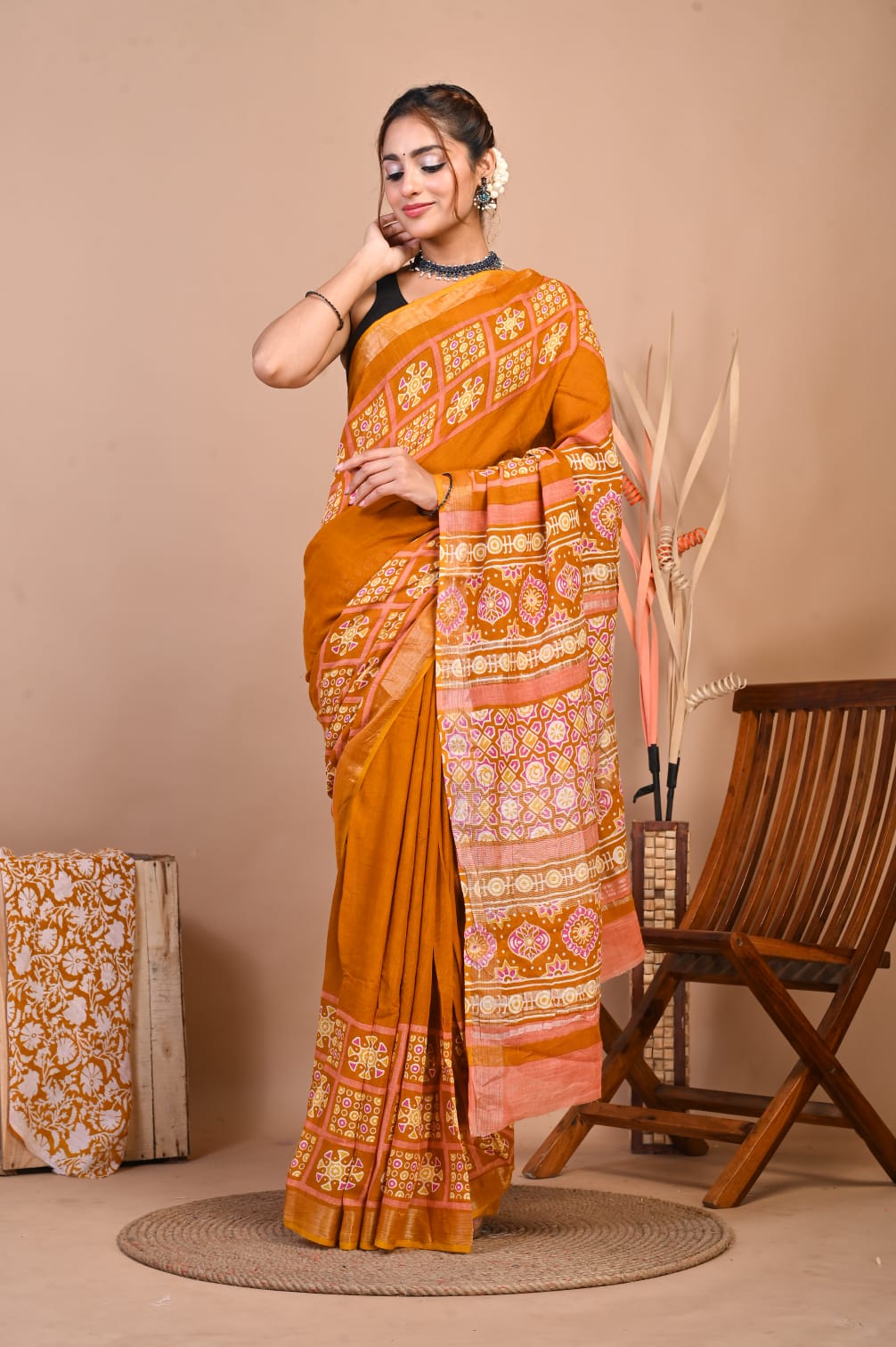 Add a touch of sophistication to your wardrobe with our Hand Block Printed Linen Cotton Saree. This 5.5-meter saree is crafted with intricate hand block prints, exuding traditional charm. Paired with a 1-meter unstitched blouse piece, it offers ample customization options. The luxurious linen-cotton blend ensures both comfort and style, making it perfect for any occasion. Elevate your ethnic wear collection with this timeless piece of elegance.