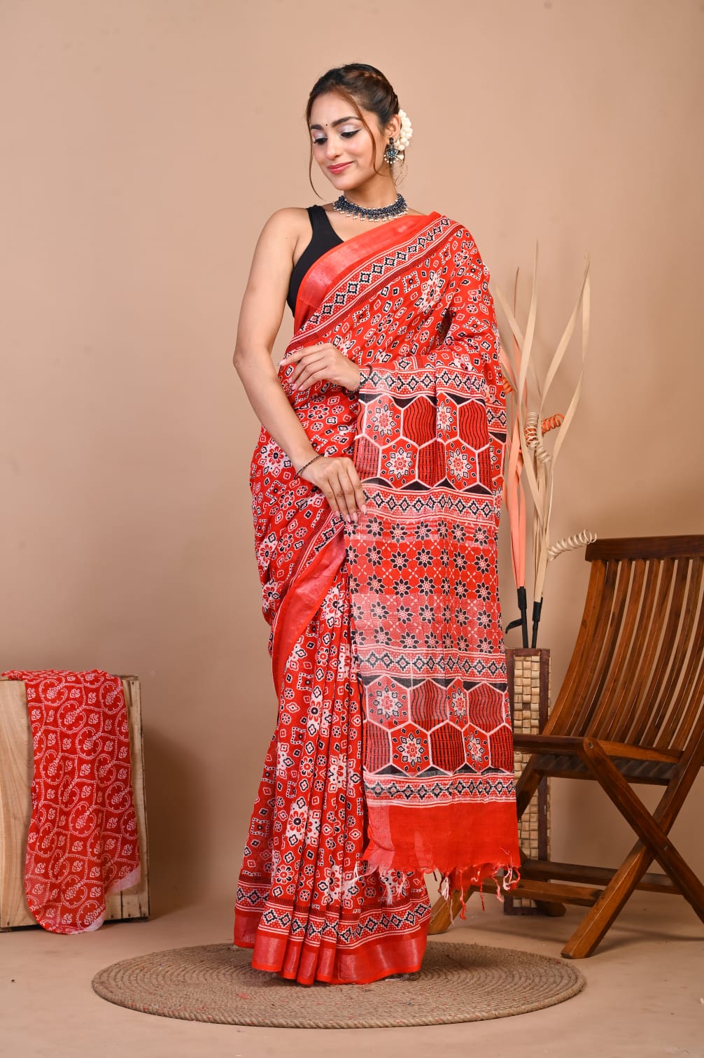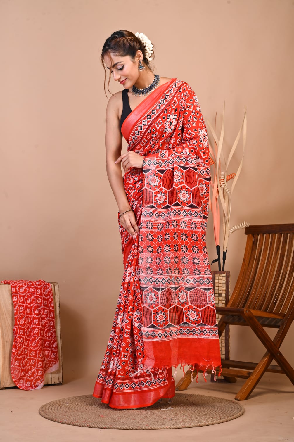 Anvi Red Color Hand Block Printed Linen Cotton Saree with Unstitched Blouse Piece