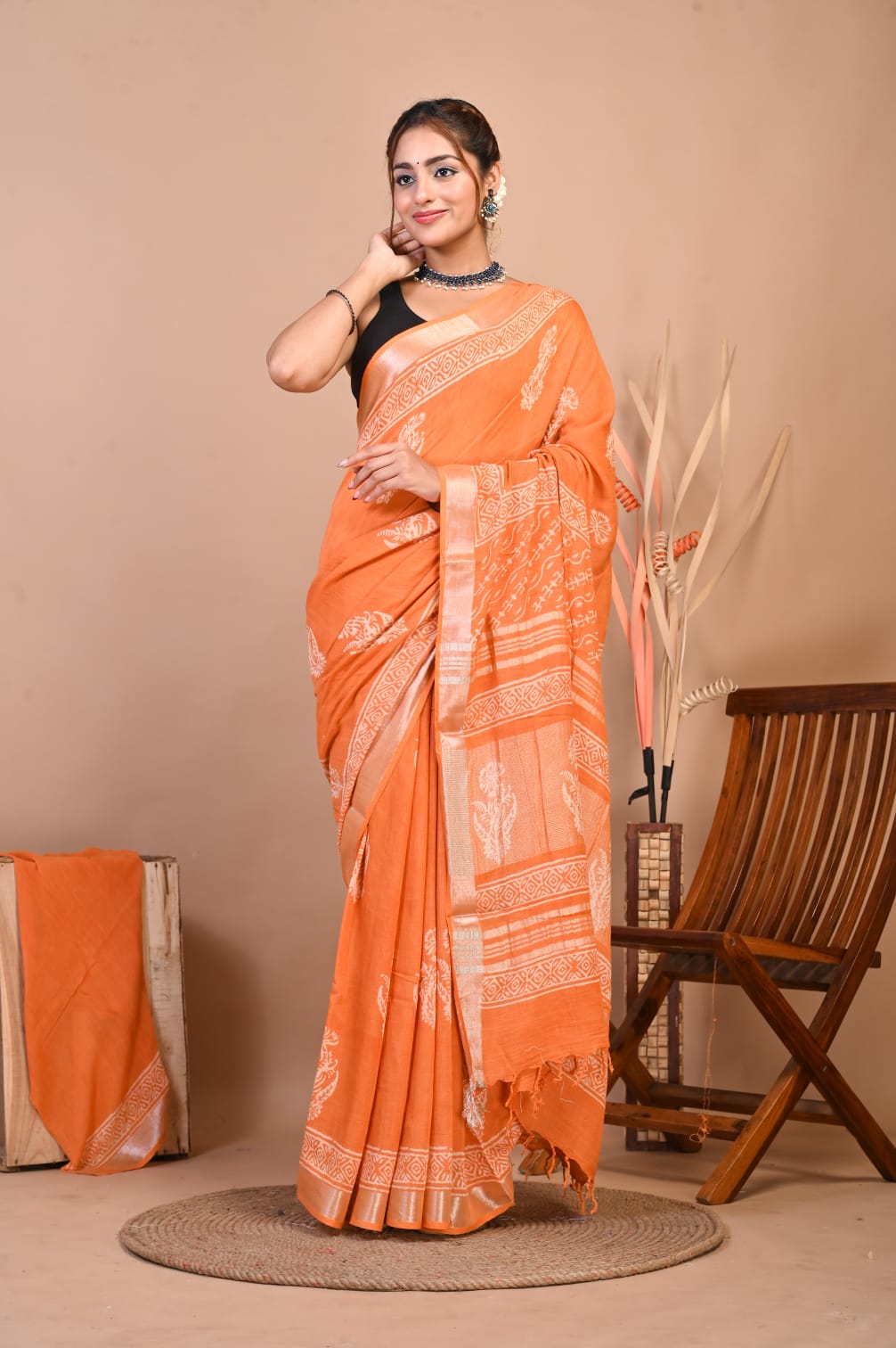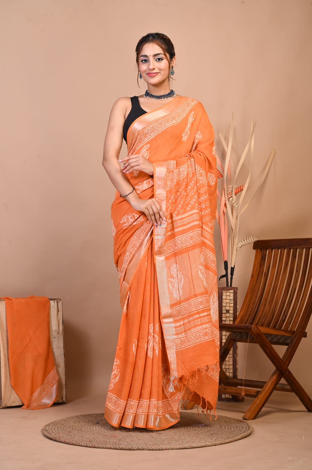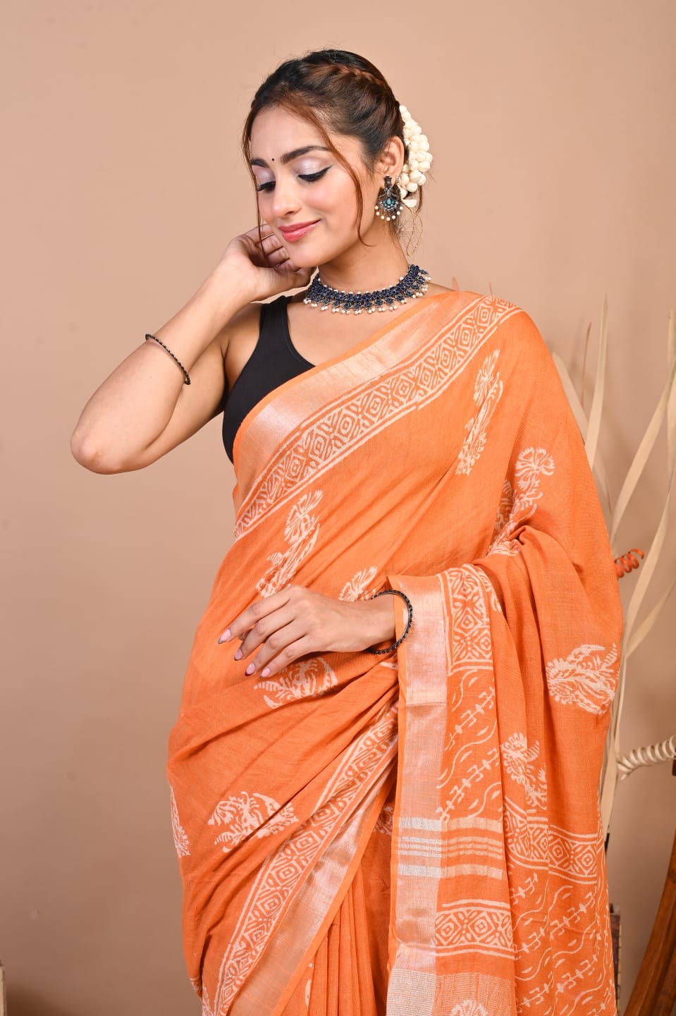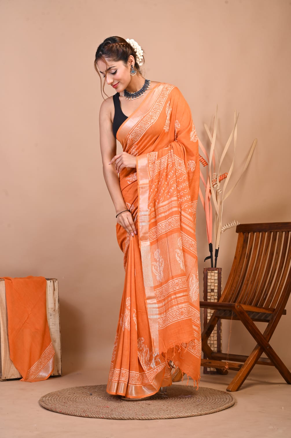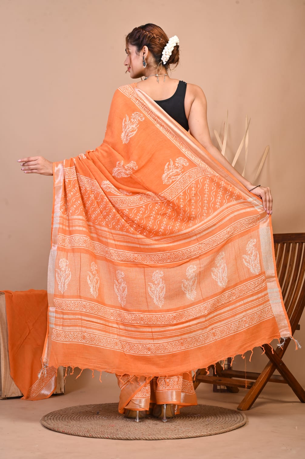 Sushma Orange Color Linen Cotton Hand Block Floral Printed Saree with Unstitched Blouse Piece