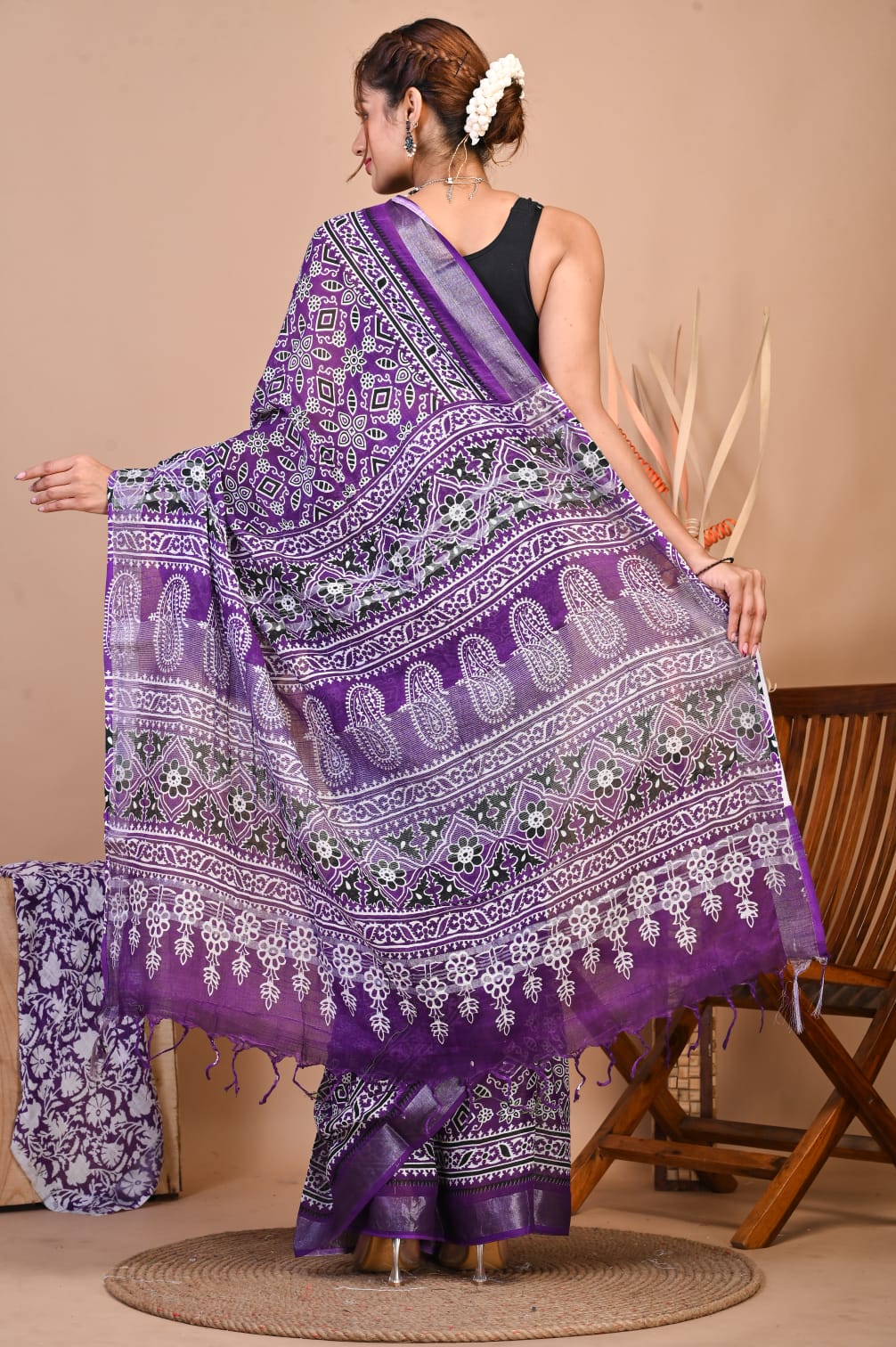 Nazia Purple Color Linen Cotton Hand Block Printed Saree with Unstitched Blouse Piece