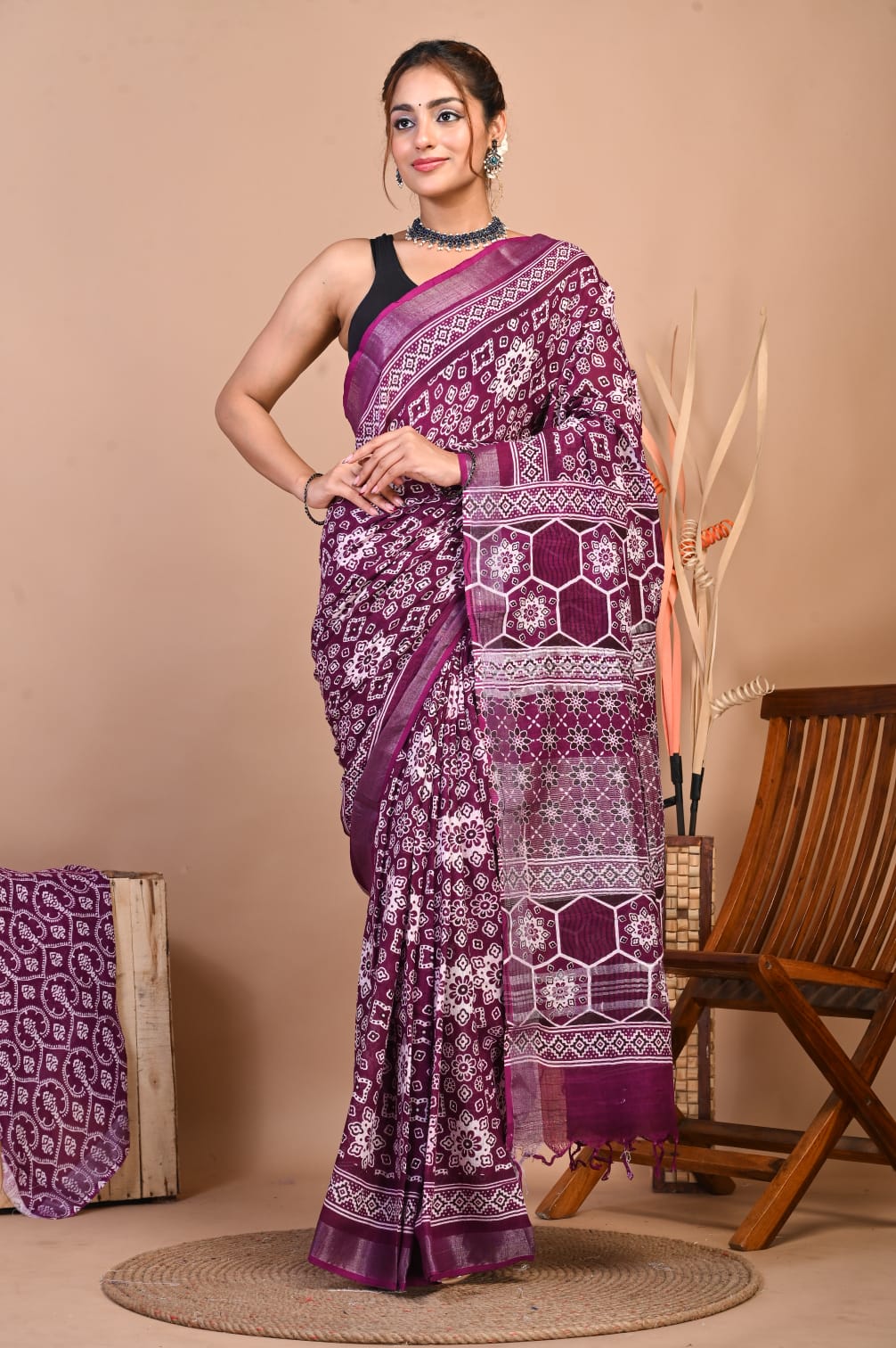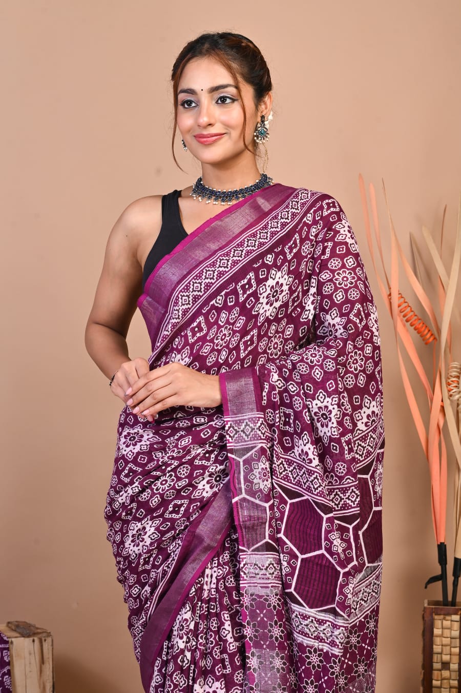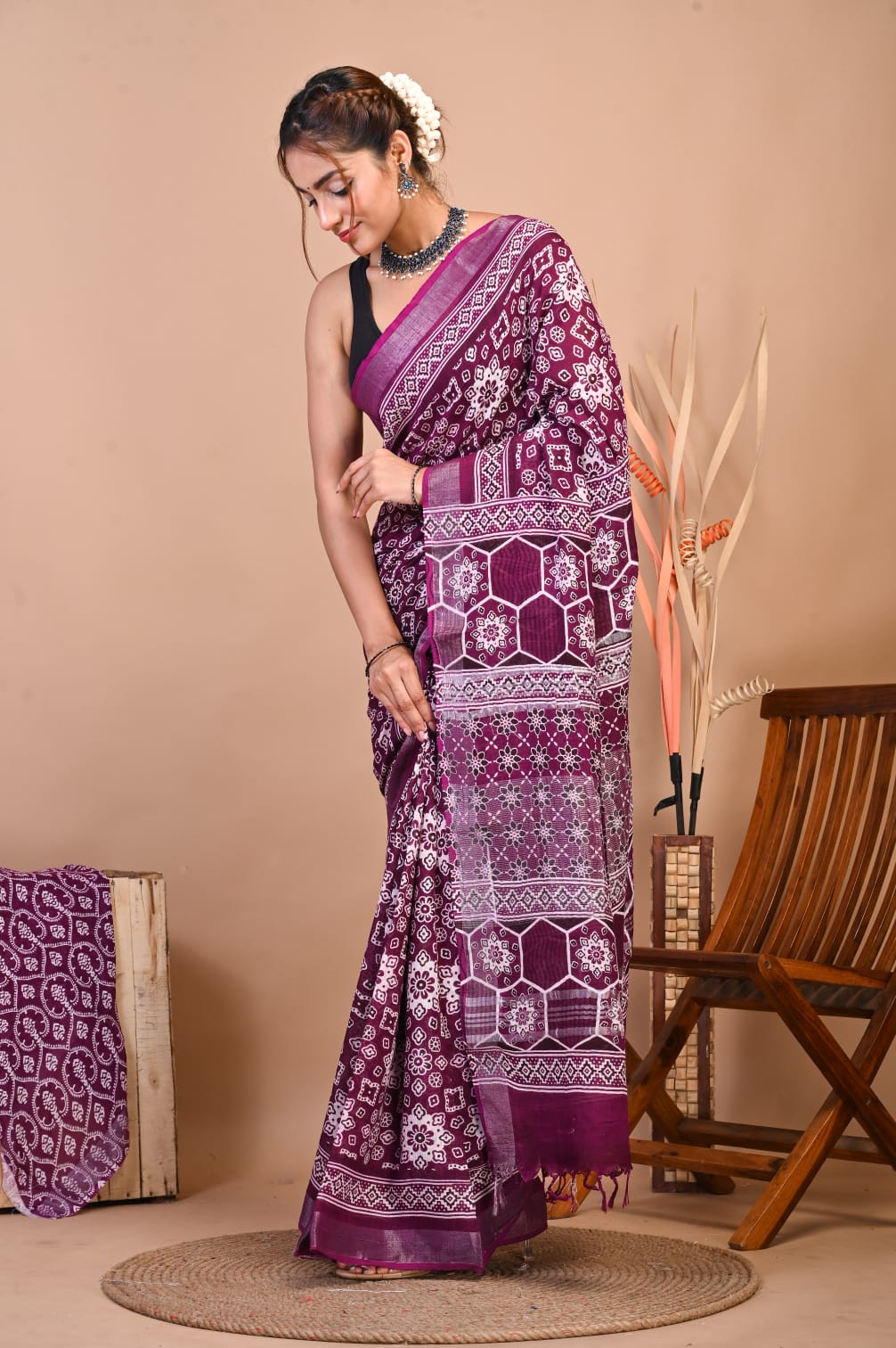 Poonam Wine Color Linen Cotton Hand Block Printed Saree with Unstitched Blouse Piece