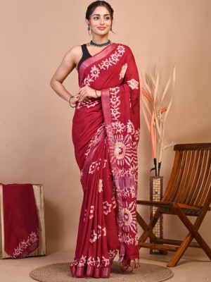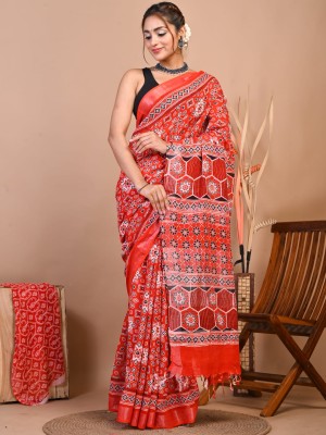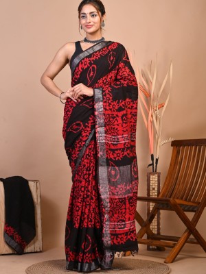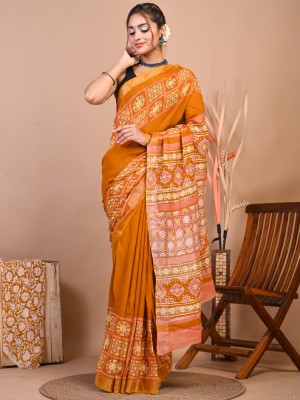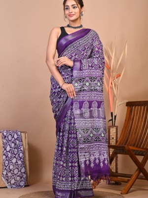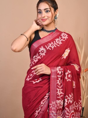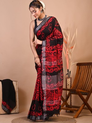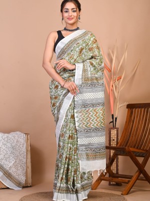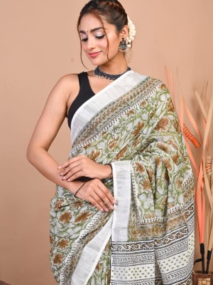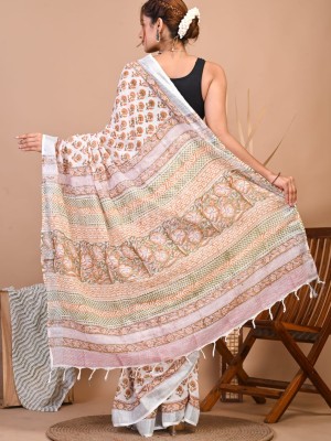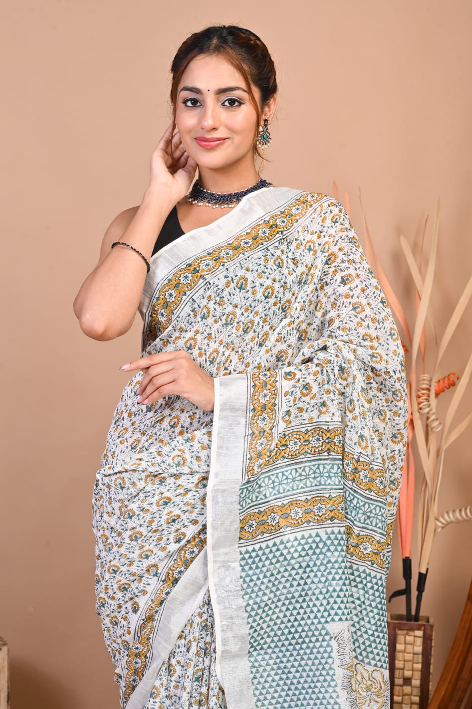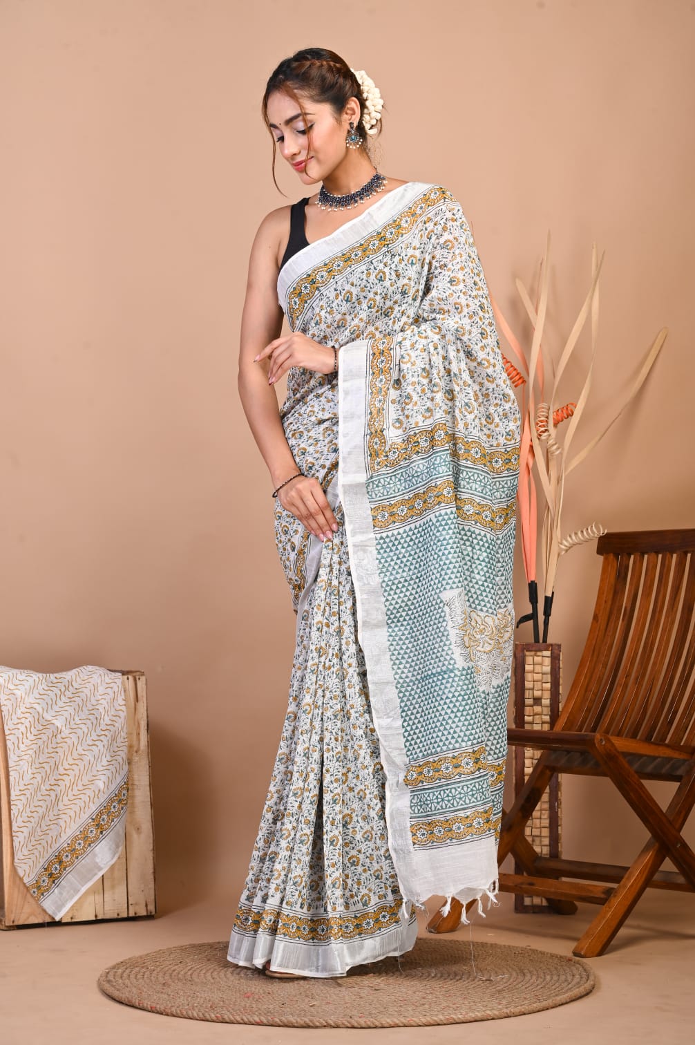 Anamika White Color Linen Cotton Hand Block Floral Printed Saree with Unstitched Blouse Piece